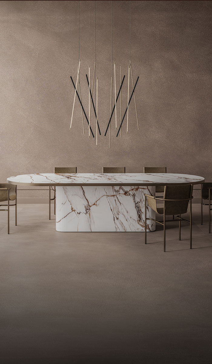 From intimate circular tables for cozy conversations to grand rectangular pieces that seat the whole family, Tailor-made+ creates dining tables in thoughtfully designed shapes and sizes. Choose from a carefully curated selection of premium Italian porcelain stoneware surfaces, from dramatic marble veining to subtle concrete textures, and pair them with our range of beautiful base options. Every detail can be customised to create something uniquely yours. Whether you're drawn to bold statement pieces or prefer understated elegance, your perfect table is waiting to be designed.