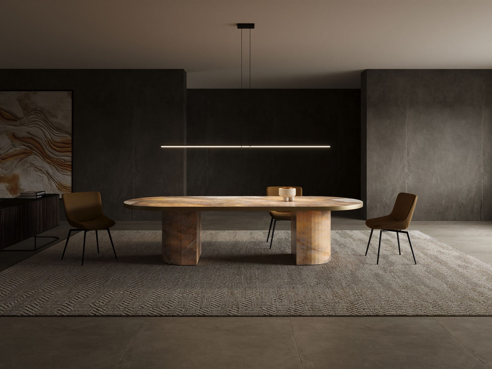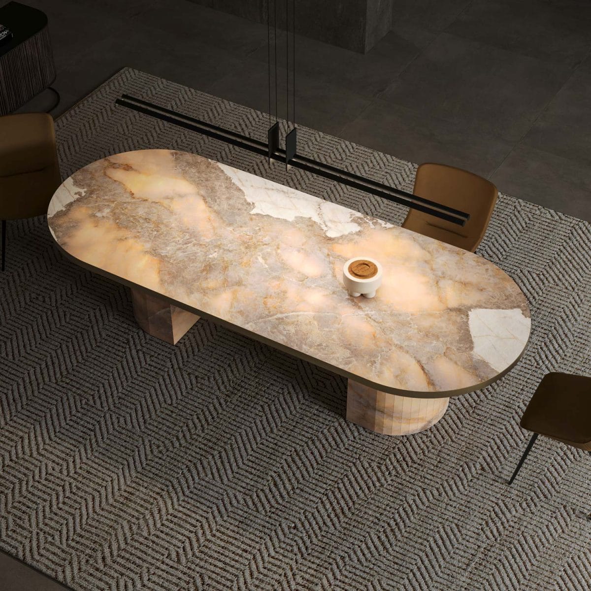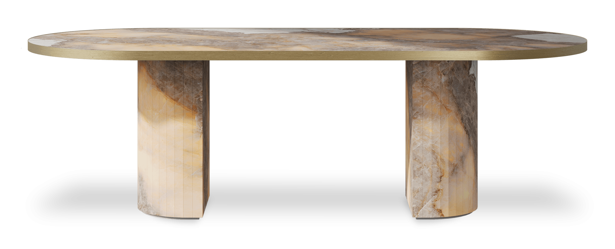 Luxury stadium-shaped dining table made from Italian porcelain stoneware, with a metal veneer edge. Features elegant twin semicircular base, metal edge veneer, and is available in 200x100cm, 220x100cm, 250x110cm, or 300x120cm sizes. Seats 8–12. Choose from marble finishes, including Calacatta and Travertine. Perfect for luxury interiors and high-end dining rooms.