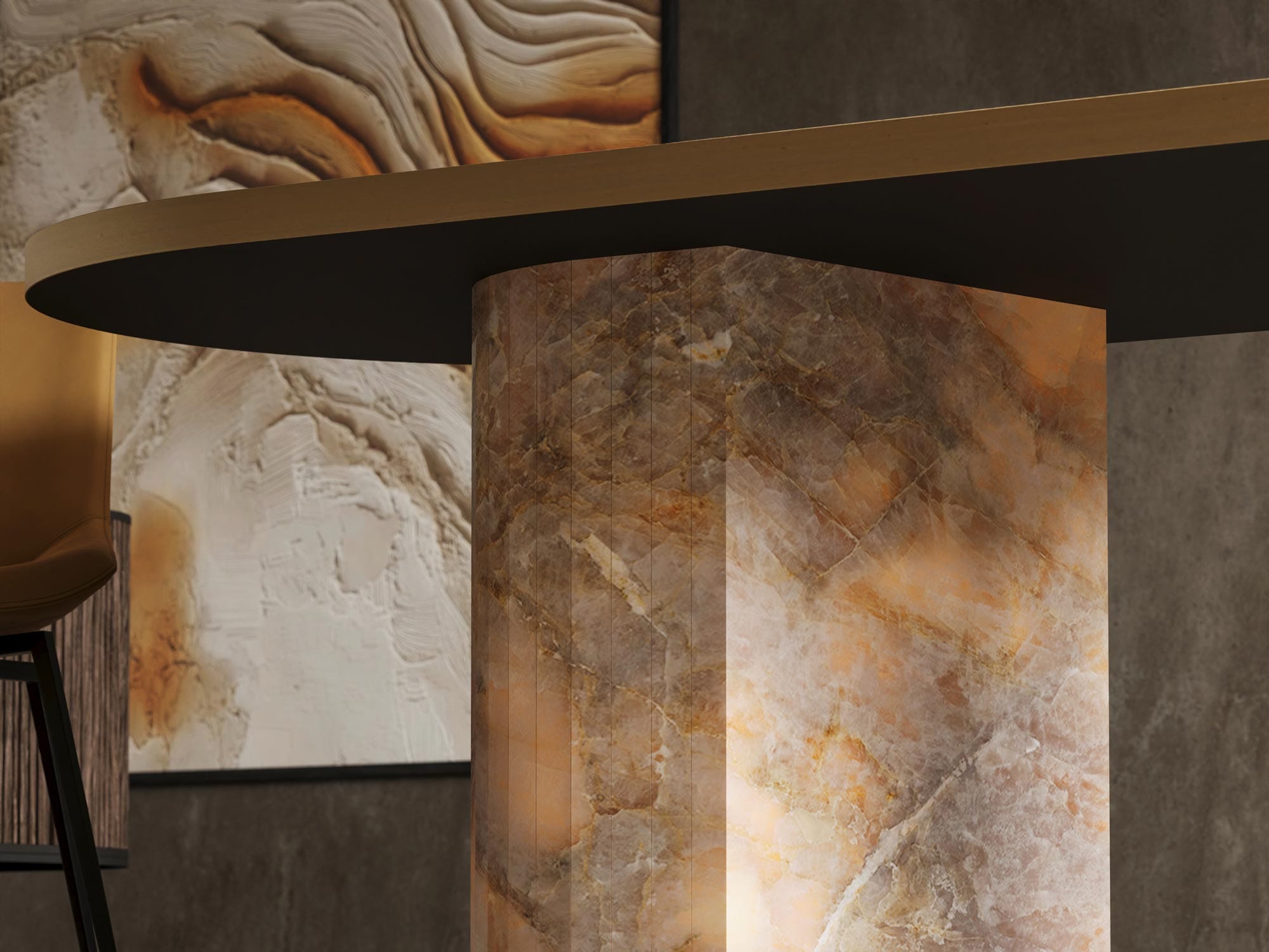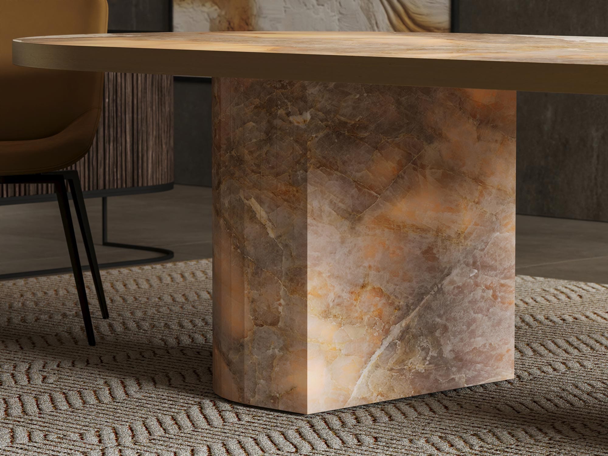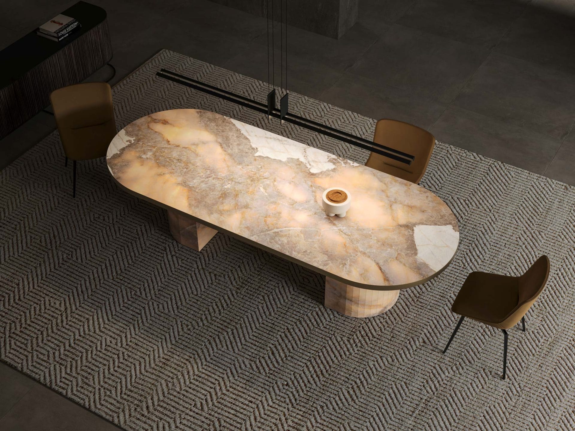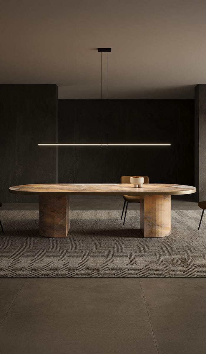 Every table we create is uniquely yours. Choose from our extensive range of porcelain surfaces, from dramatic marble effects to subtle concrete textures, then select the perfect base to complement your style. Whether you prefer the clean lines of our geometric Alveo base, the classical elegance of Colonna columns, or the natural warmth of Romano wood, every element can be tailored to your vision.