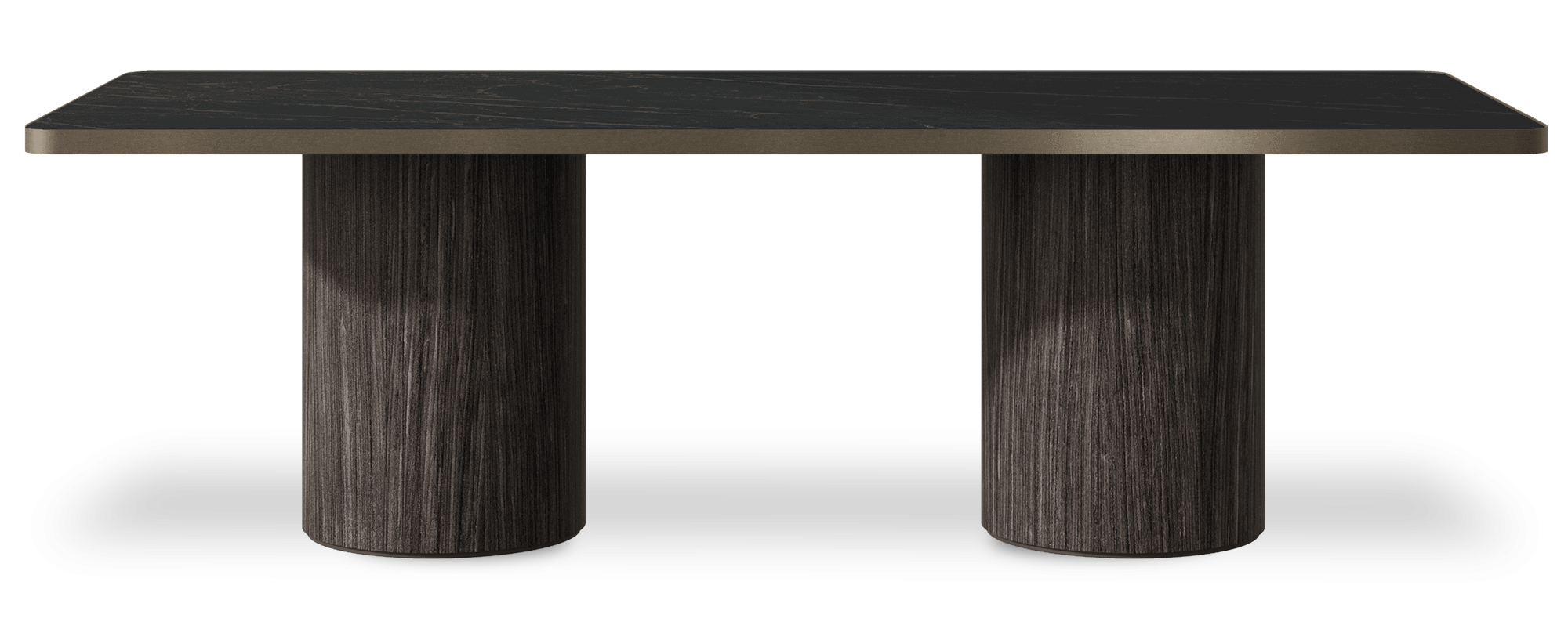 Luxury rectangular top crafted from premium Italian porcelain stoneware, featuring a metal edge veneer profile. Standing on twin column bases and available in 200x100cm, 220x100cm, 250x110cm, or 300x120cm sizes. Available in a variety of tops and leg colours. Seats 8–12. Choose from marble finishes, including Calacatta and Travertine. Perfect for luxury interiors and high-end dining rooms.