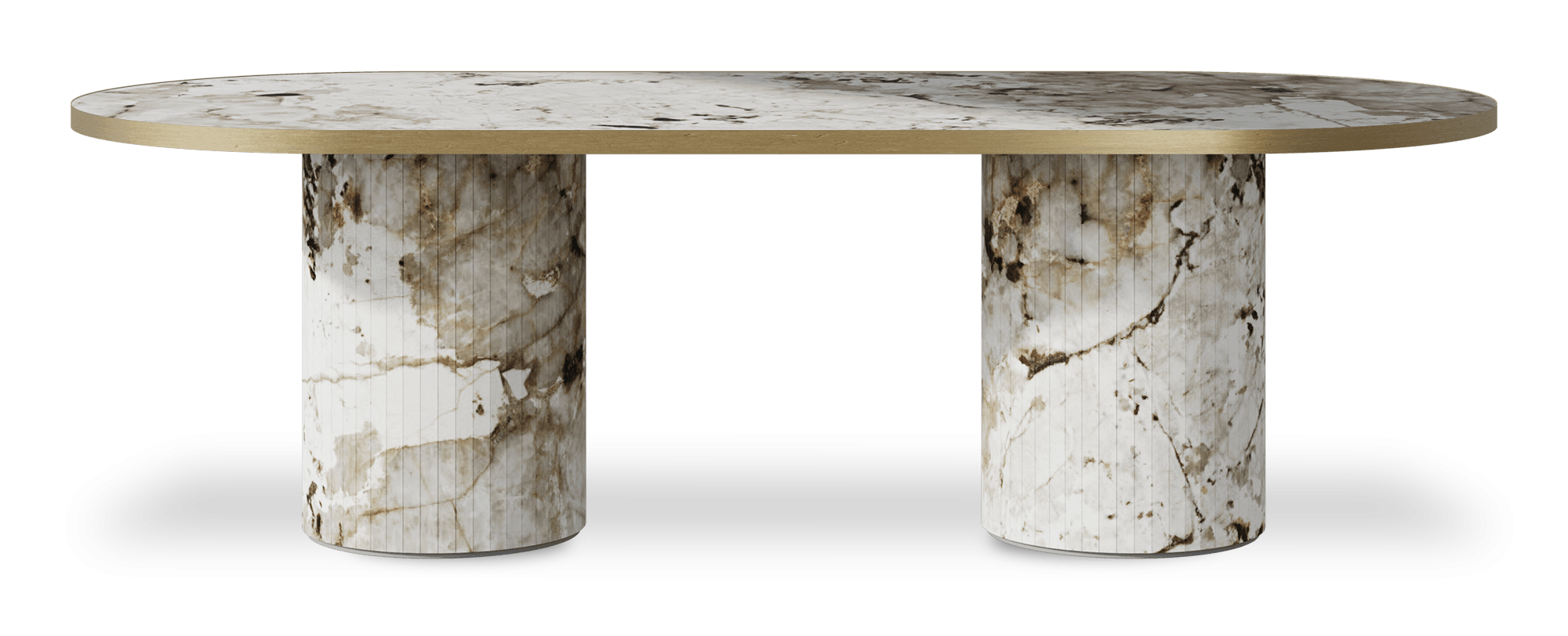 Luxury rounded dining table created from Italian porcelain stoneware, with a metal veneer edge that provides elegant finishing touches. The base features twin columns that bring architectural charm and visual interest to any space. Available in 200x100cm, 220x100cm, 250x110cm, or 300x120cm sizes. Seats 8–12. Choose from marble finishes, including Calacatta and Travertine. Perfect for luxury interiors and high-end dining rooms.