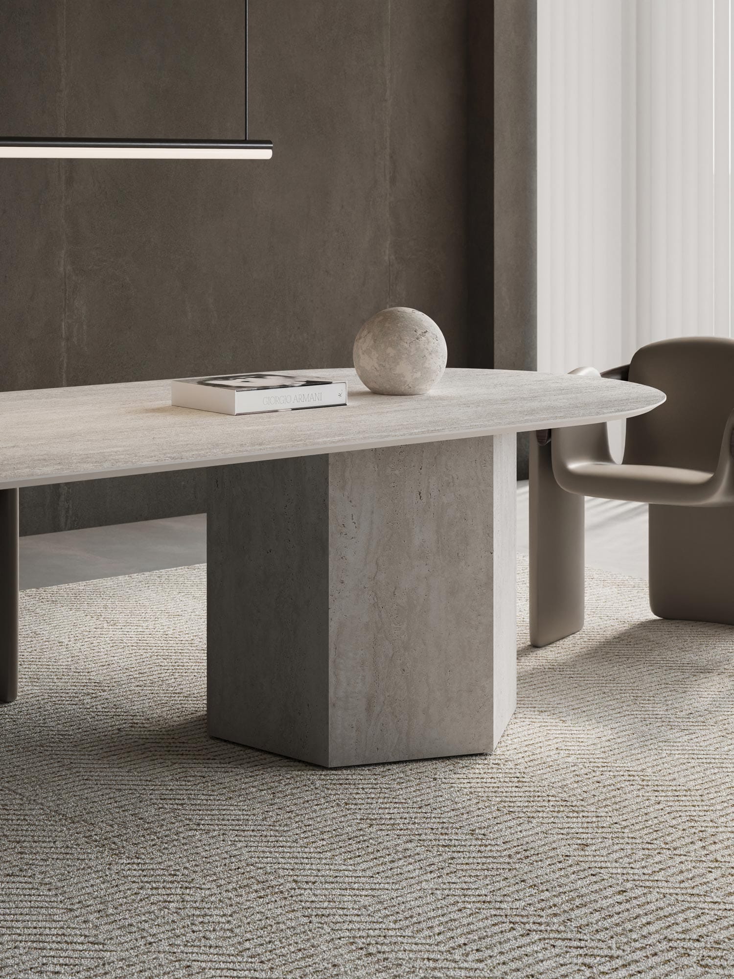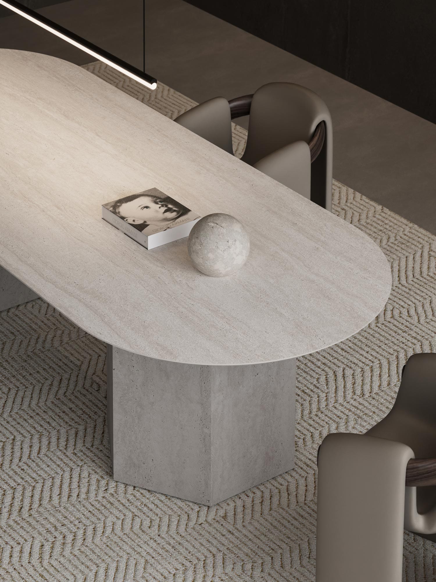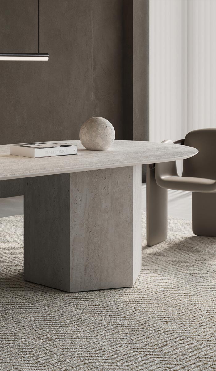 Every table we create is uniquely yours. Choose from our extensive range of porcelain surfaces, from dramatic marble effects to subtle concrete textures, then select the perfect base to complement your style. Whether you prefer the clean lines of our geometric Alveo base, the classical elegance of Colonna columns, or the natural warmth of Romano wood, every element can be tailored to your vision.