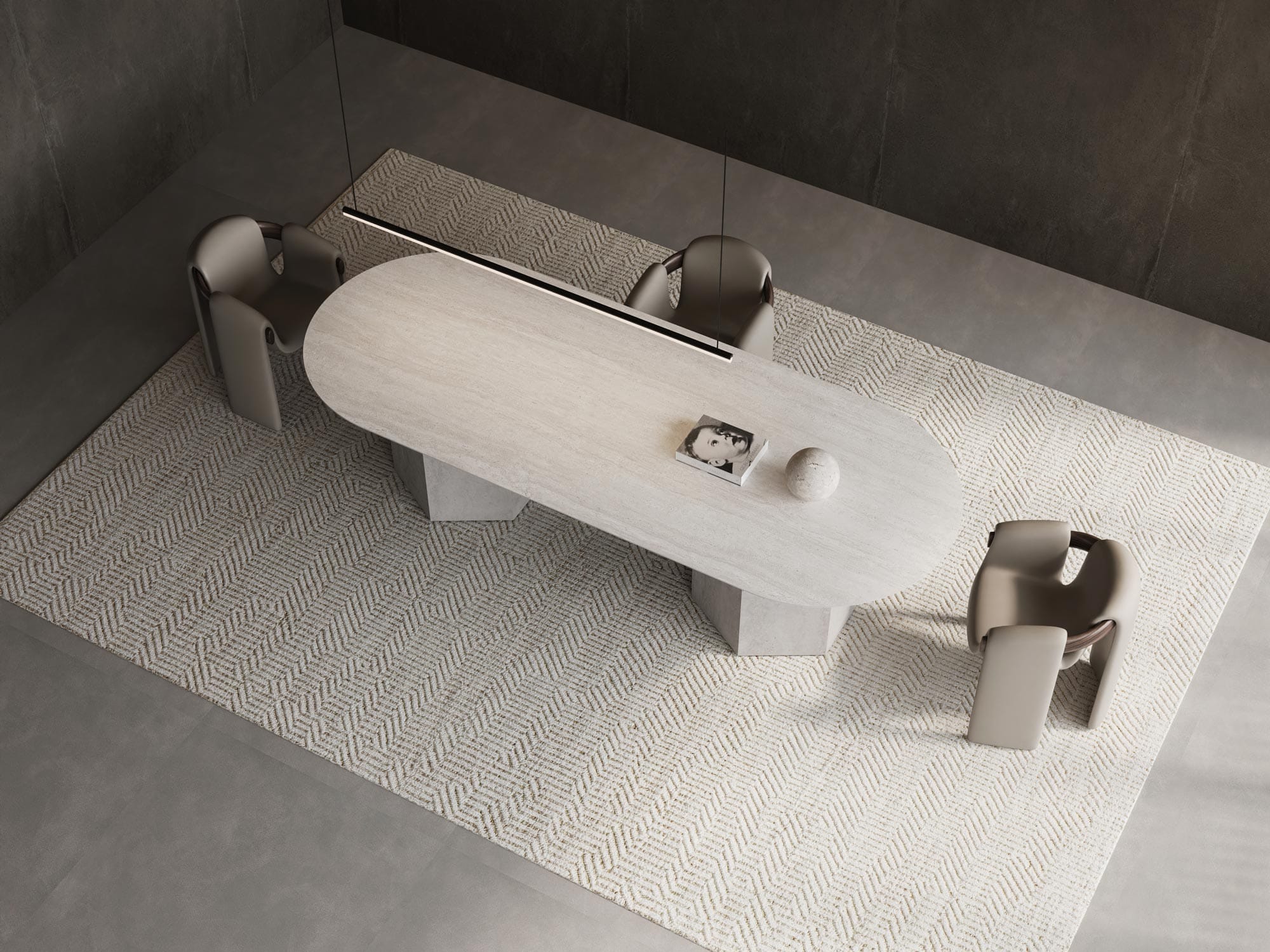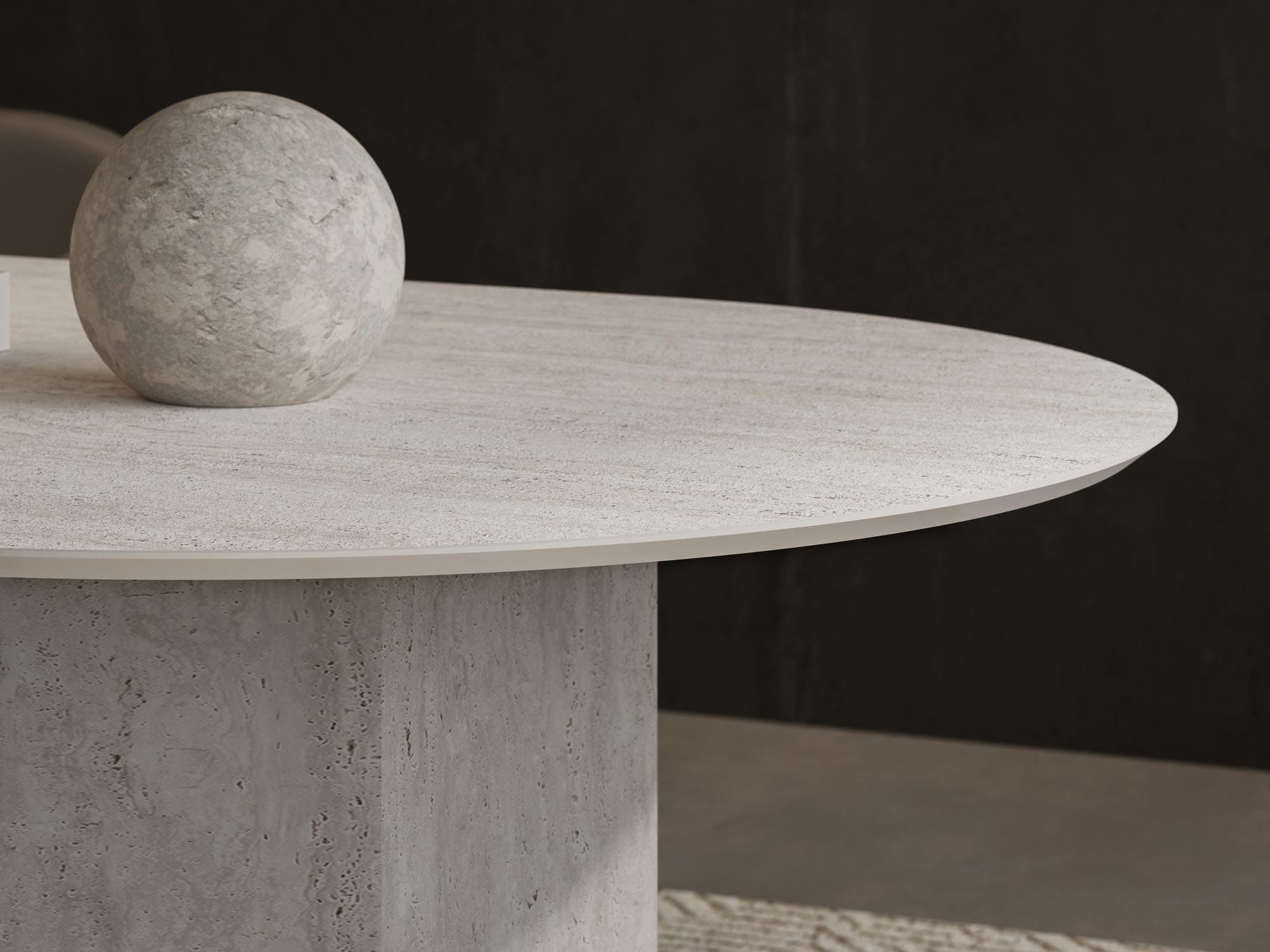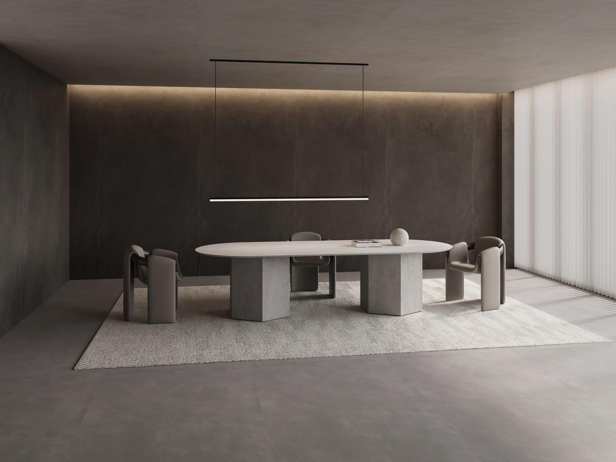 Every table we create is uniquely yours. Choose from our extensive range of porcelain surfaces, from dramatic marble effects to subtle concrete textures, then select the perfect base to complement your style. Whether you prefer the clean lines of our geometric Alveo base, the classical elegance of Colonna columns, or the natural warmth of Romano wood, every element can be tailored to your vision.