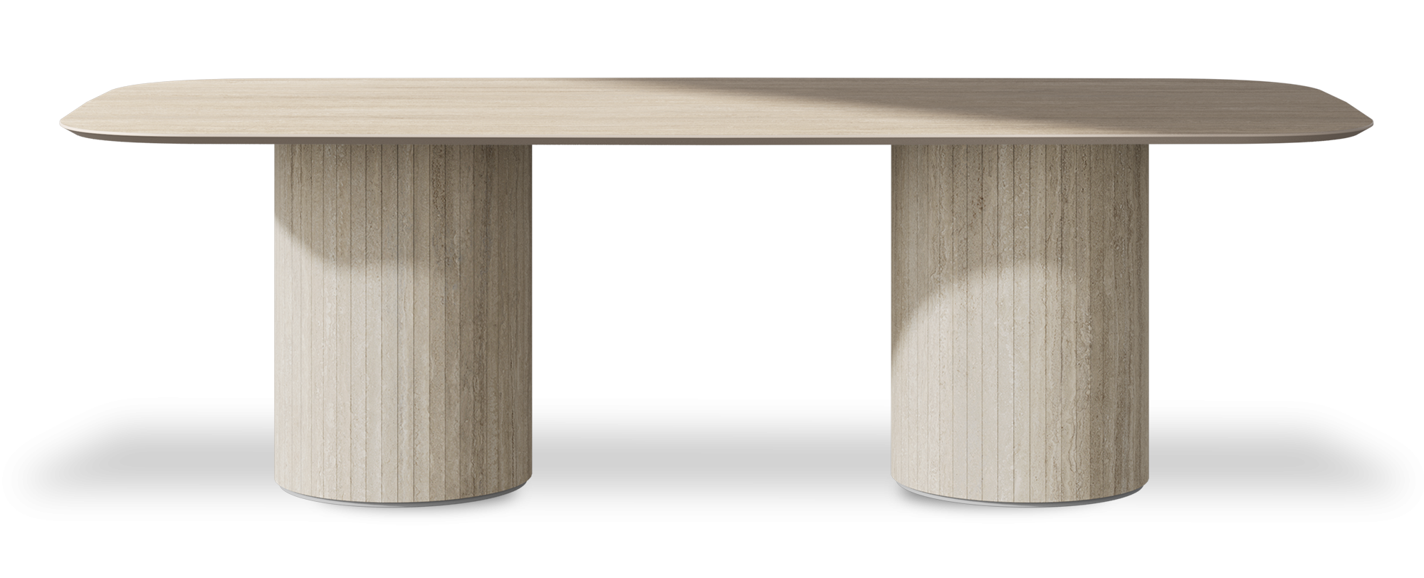 Precision-engineered luxury dining table, handcrafted at our Chatteris facility in Britain from Italian porcelain. Distinctive 20mm shark nose edge defines its elegant profile. Twin column base supports a sculptural form. Available in four understated finishes, spanning sizes 200–300cm. Made to order. Seats eight to twelve.