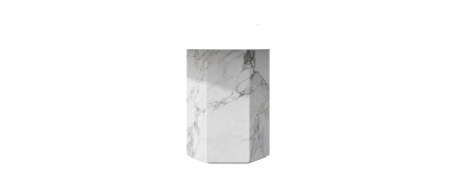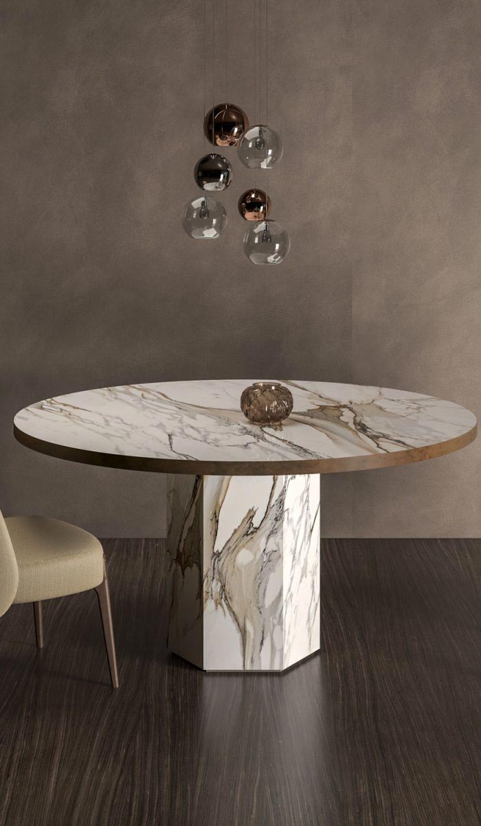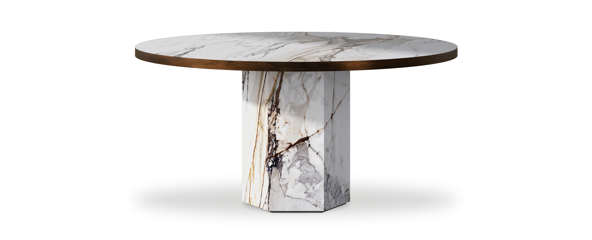 Luxury bespoke porcelain dining table, handcrafted in the UK and made to order. Available in 120cm or 150cm circular top, with a metal veneer and striking hexagon base. Prices from £3,480. Seats 6–8. Choose from marble finishes, including Calacatta and Travertine. Perfect for luxury interiors and high-end dining rooms.