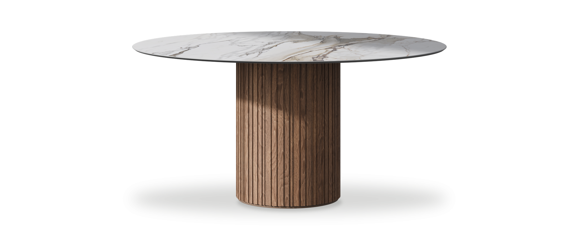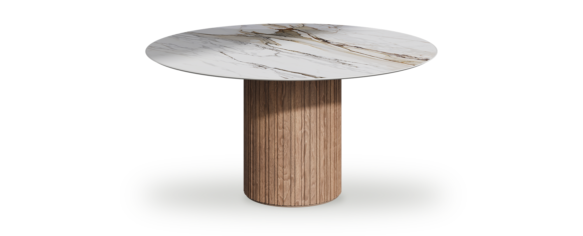 This dining table features a circular tabletop made from Italian porcelain stoneware, with a shark nose edge profile and a top thickness of 12mm. Available in an array of finishes, the surface options include stunning marble, stone, and concrete effects that cater to both traditional and modern tastes. The natural wooden column base provides sturdy support while contributing warmth and character to the design. Expertly made in the UK, each table represents quality construction and careful attention to detail. From subtle, refined aesthetics to vibrant, attention-grabbing designs, the broad spectrum of styles accommodates diverse preferences. This extensive variety empowers you to choose the perfect table that harmonises with your unique style and enhances your dining space beautifully. Model shown 150cm.
