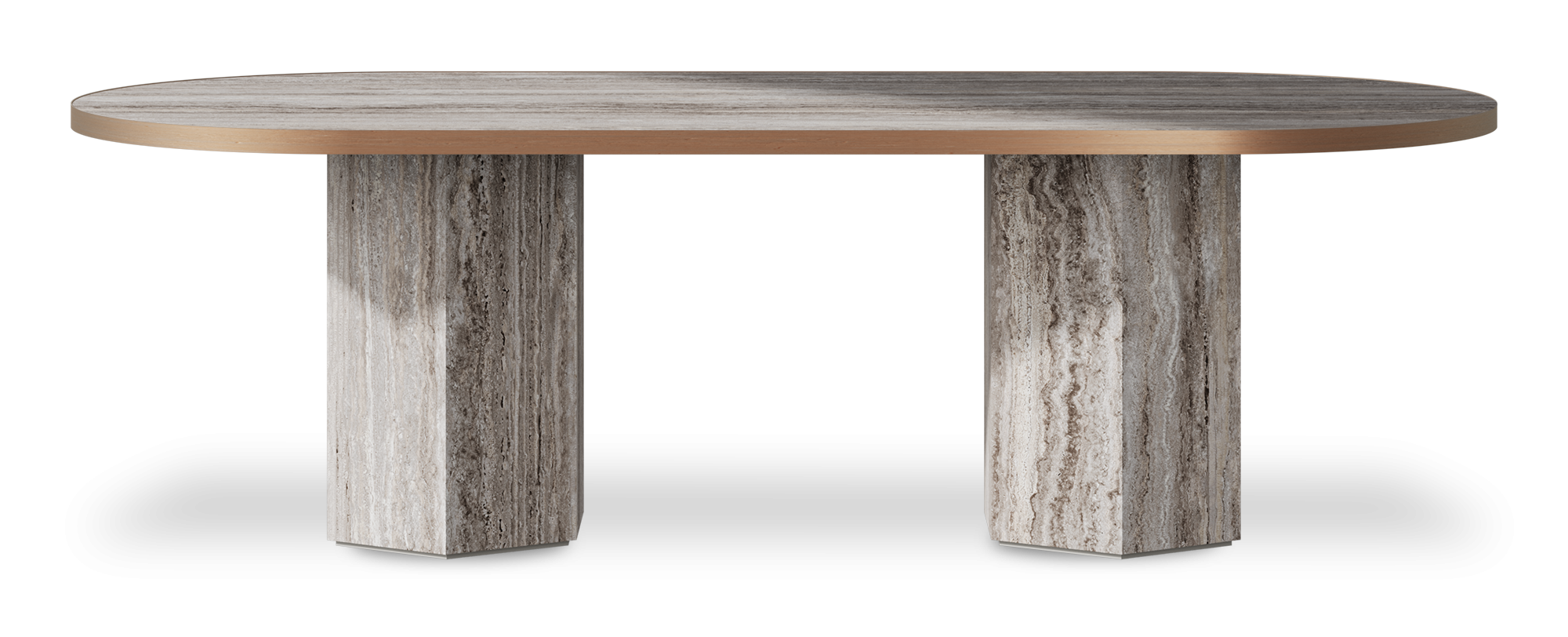Luxury stadium-shaped tabletop, hewn from premium Italian porcelain stoneware and bordered with a metal veneer edge, featuring twin hexagonal bases. Available in 200x100cm, 220x100cm, 250x110cm, or 300x120cm sizes. Seats 8–12. Choose from marble finishes, including Calacatta and Travertine. Perfect for luxury interiors and high-end dining rooms.