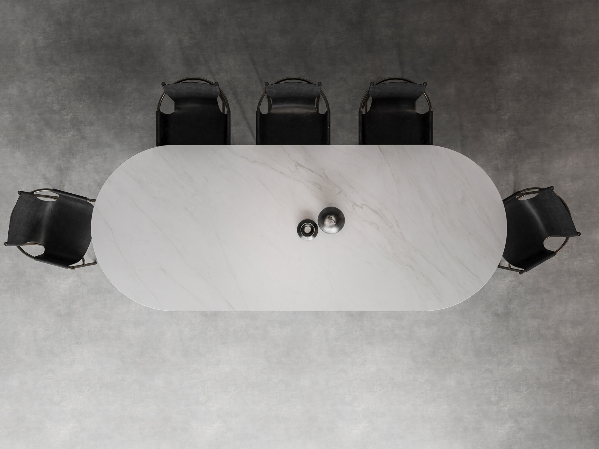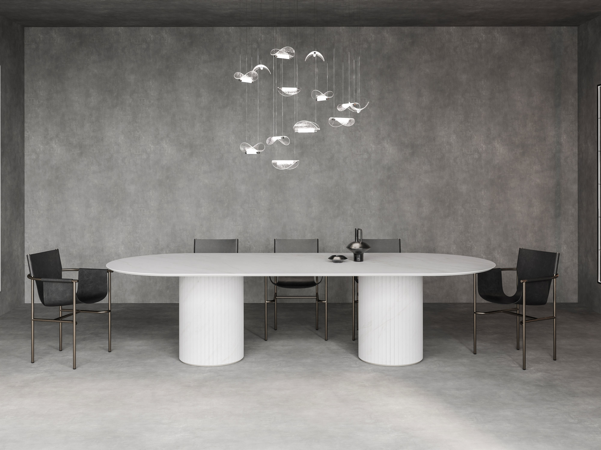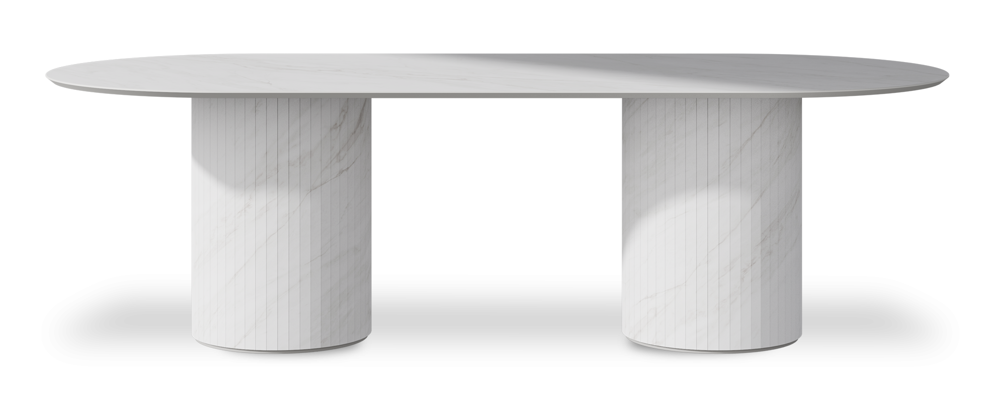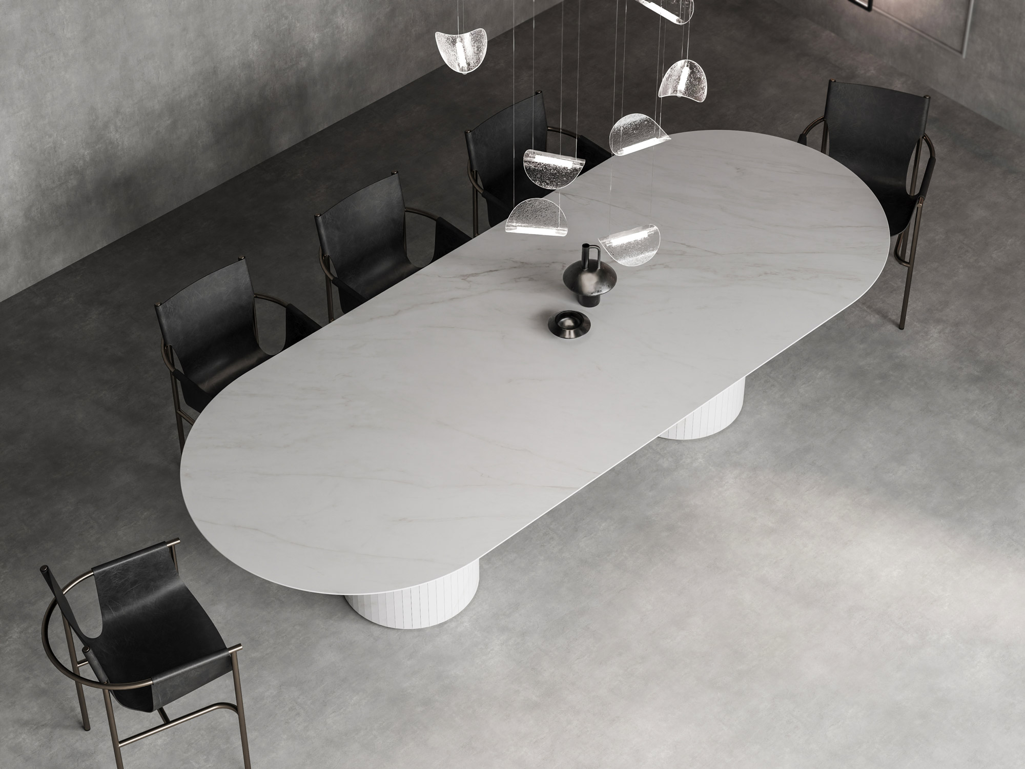 Luxury stadium-shaped tabletop, made from Italian porcelain stoneware, features a special shark nose edge and a substantial 20mm profile, paired with a twin column base that adds sculptural flair. Available in 200x100cm, 220x100cm, 250x110cm, or 300x120cm sizes. Seats 8–12. Choose from marble finishes, including Calacatta and Travertine. Perfect for luxury interiors and high-end dining rooms.