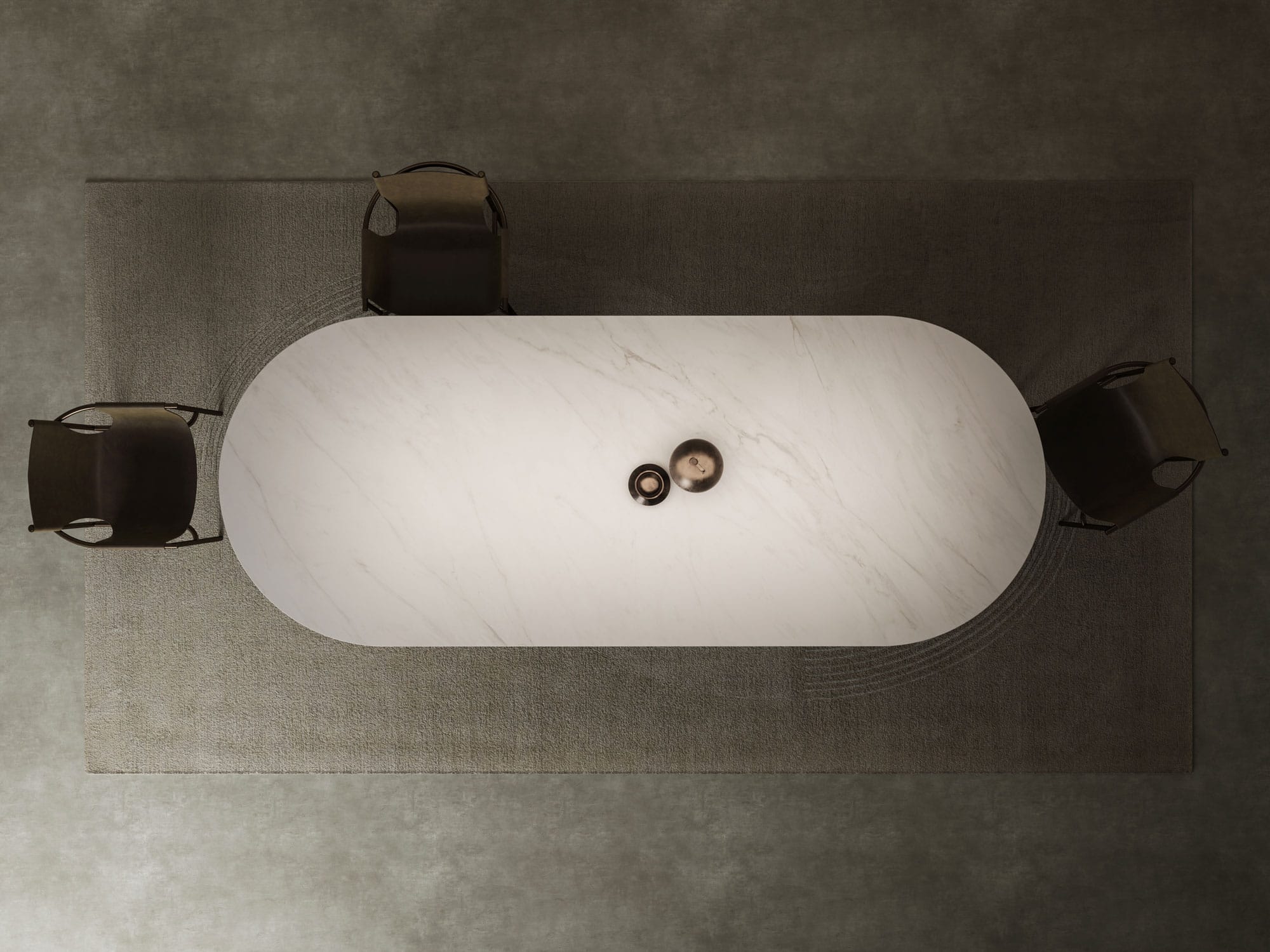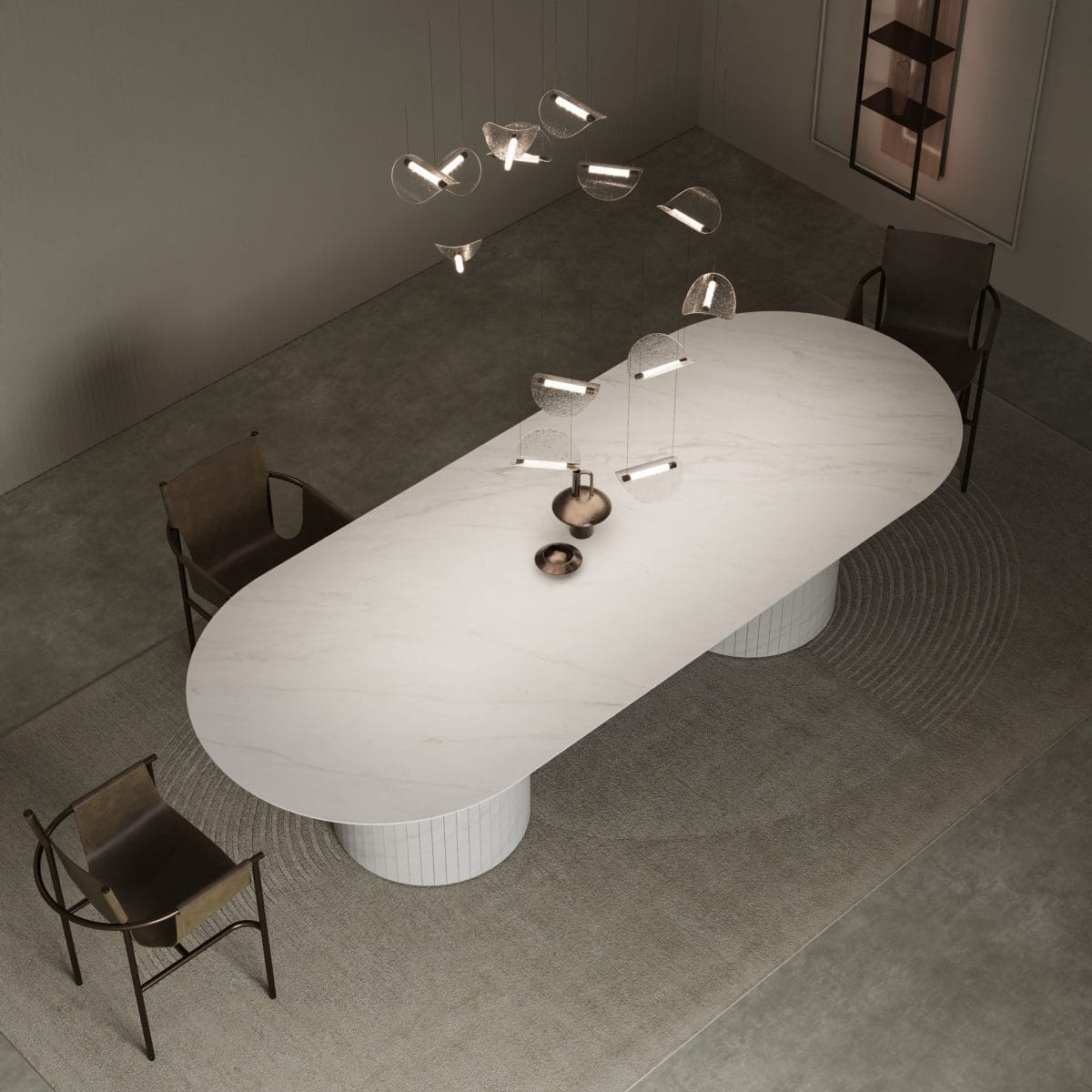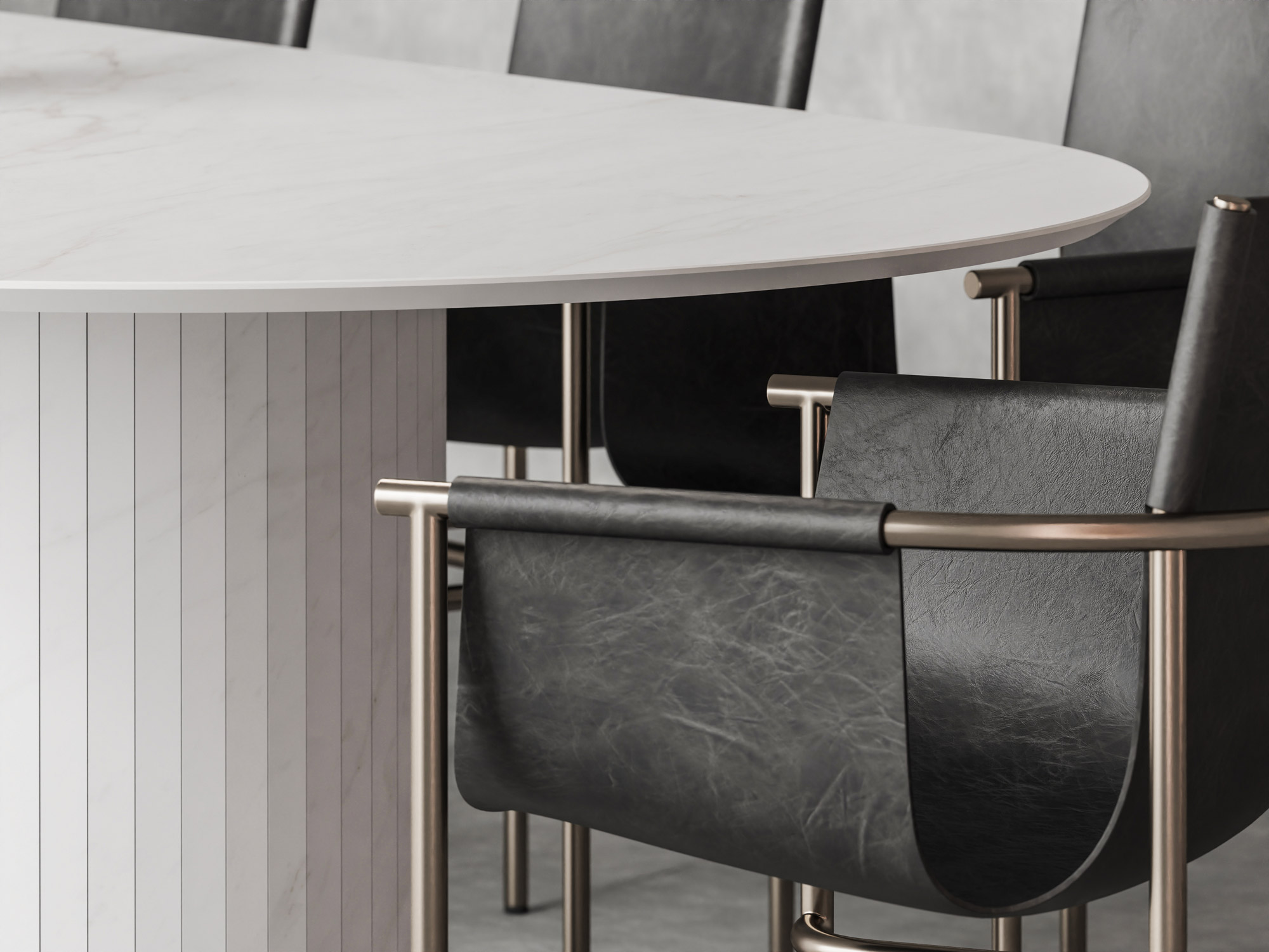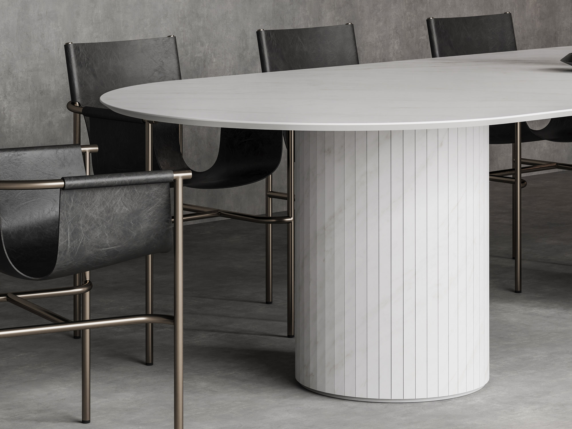 Luxury stadium-shaped tabletop, made from Italian porcelain stoneware, features a special shark nose edge and a substantial 20mm profile, paired with a twin column base that adds sculptural flair. Available in 200x100cm, 220x100cm, 250x110cm, or 300x120cm sizes. Seats 8–12. Choose from marble finishes, including Calacatta and Travertine. Perfect for luxury interiors and high-end dining rooms.