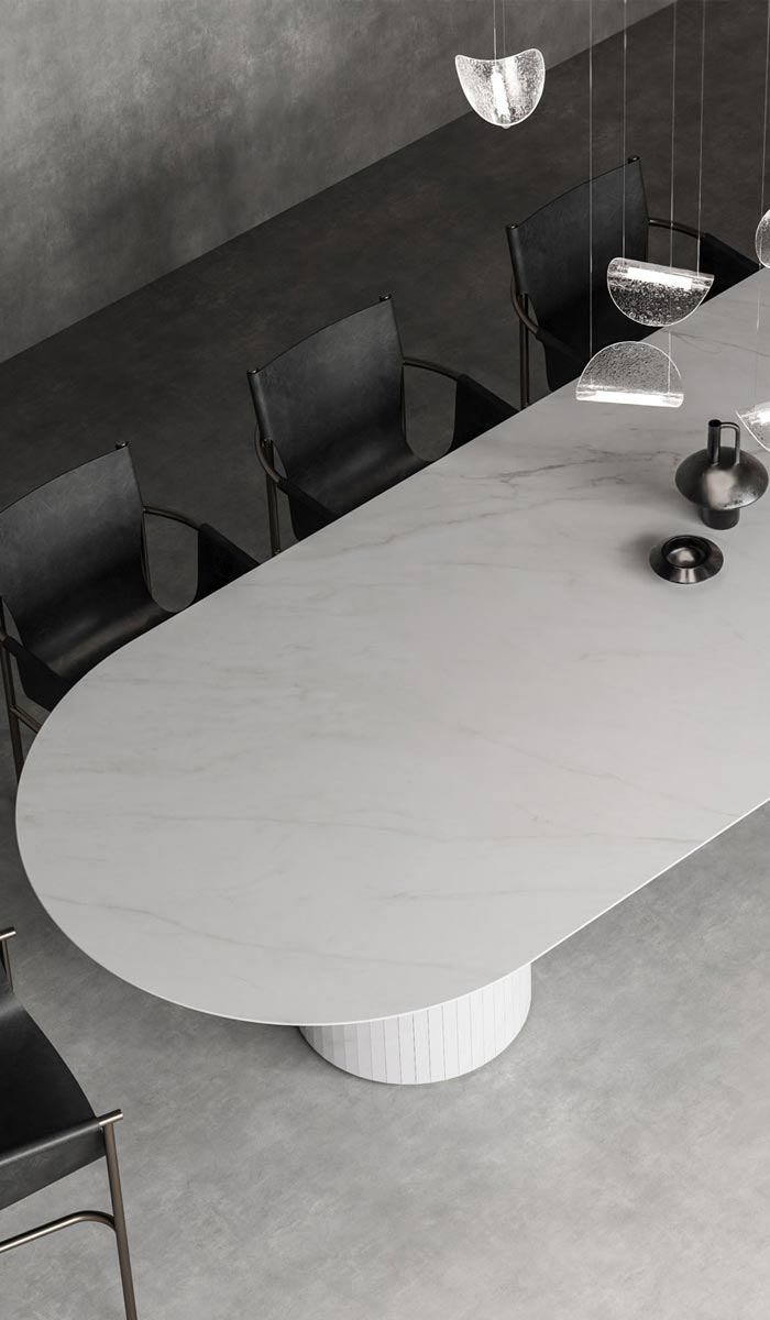 Every table we create is uniquely yours. Choose from our extensive range of porcelain surfaces, from dramatic marble effects to subtle concrete textures, then select the perfect base to complement your style. Whether you prefer the clean lines of our geometric Alveo base, the classical elegance of Colonna columns, or the natural warmth of Romano wood, every element can be tailored to your vision.