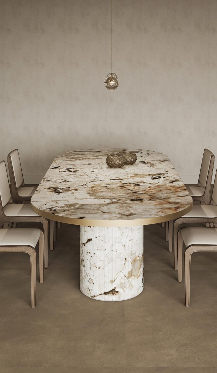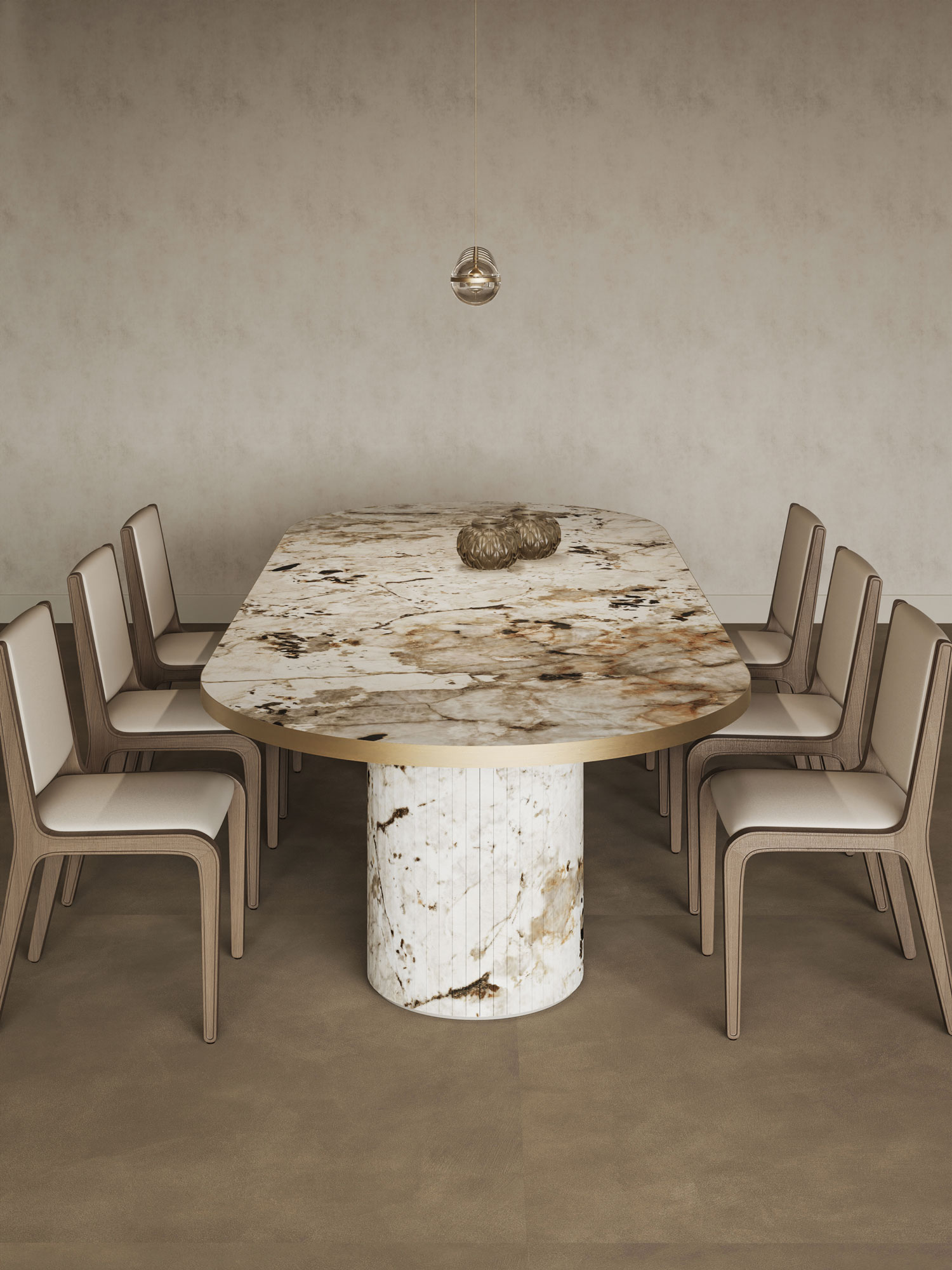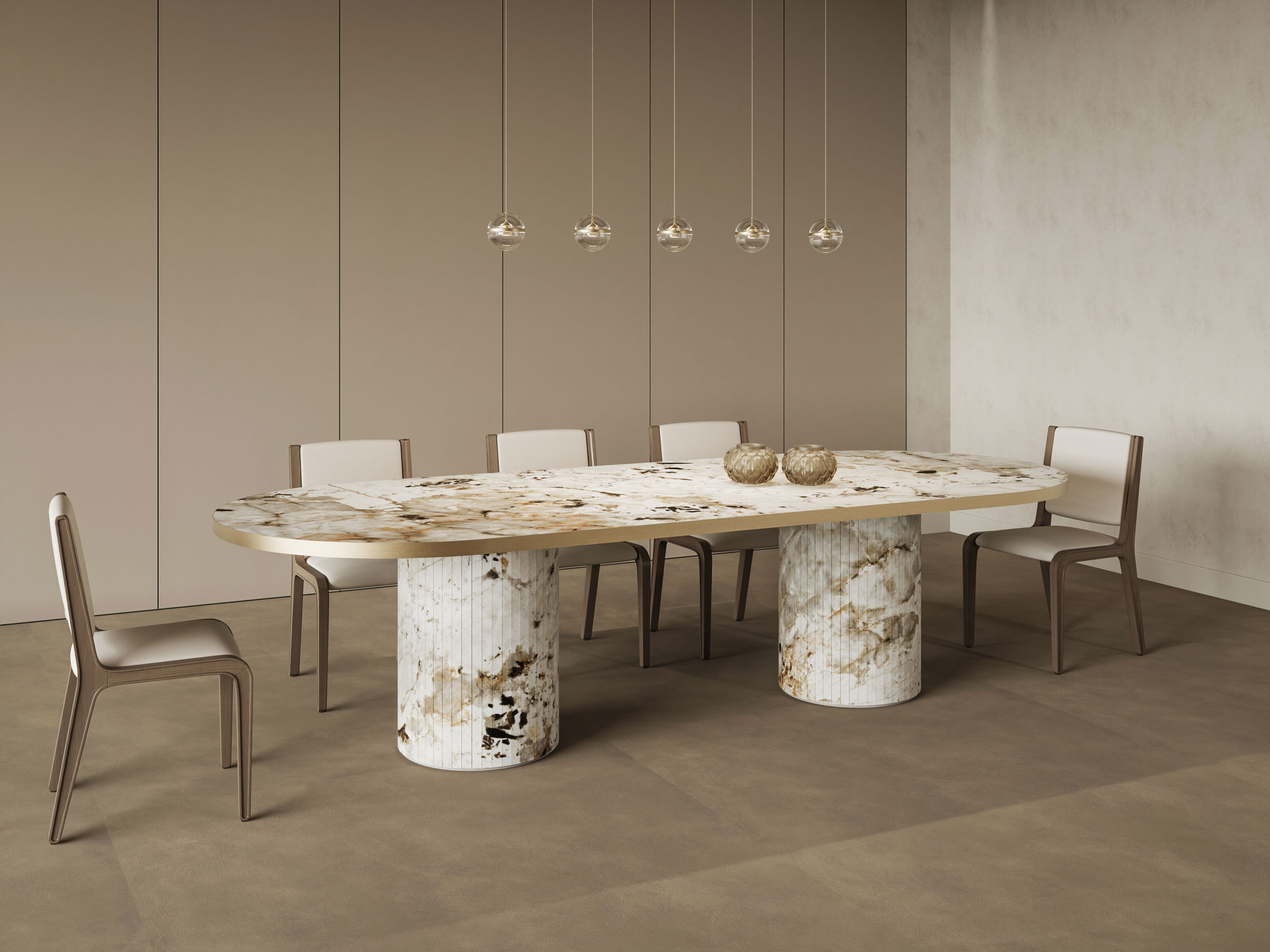 Luxury rounded dining table created from Italian porcelain stoneware, with a metal veneer edge that provides elegant finishing touches. The base features twin columns that bring architectural charm and visual interest to any space. Available in 200x100cm, 220x100cm, 250x110cm, or 300x120cm sizes. Seats 8–12. Choose from marble finishes, including Calacatta and Travertine. Perfect for luxury interiors and high-end dining rooms.