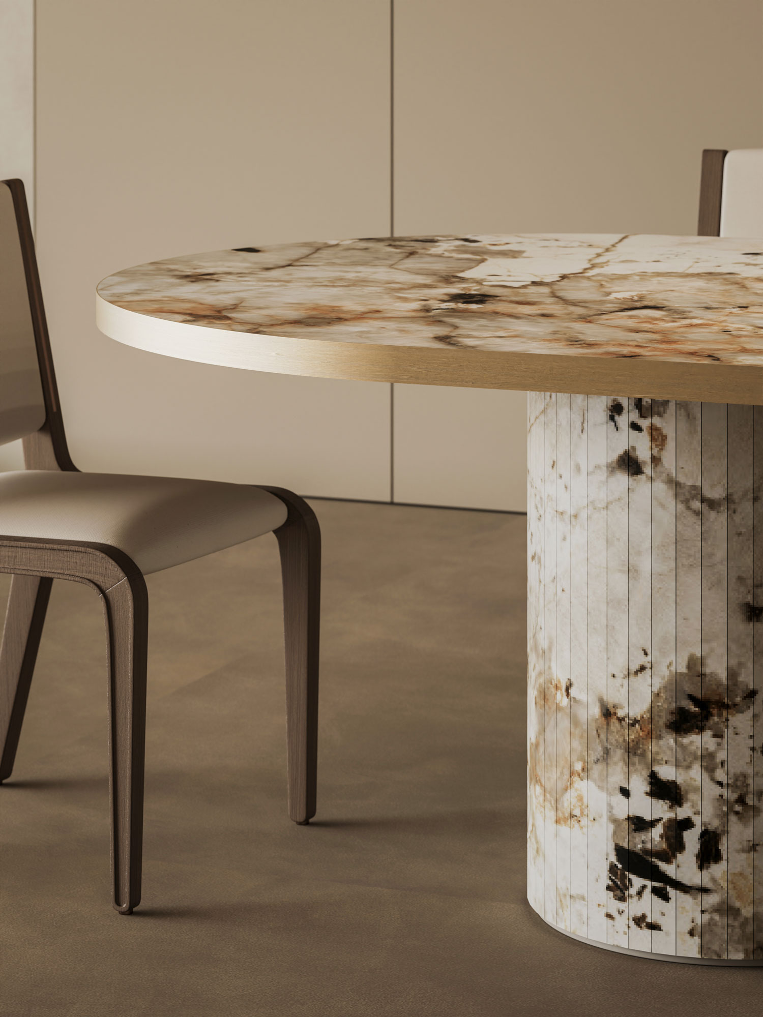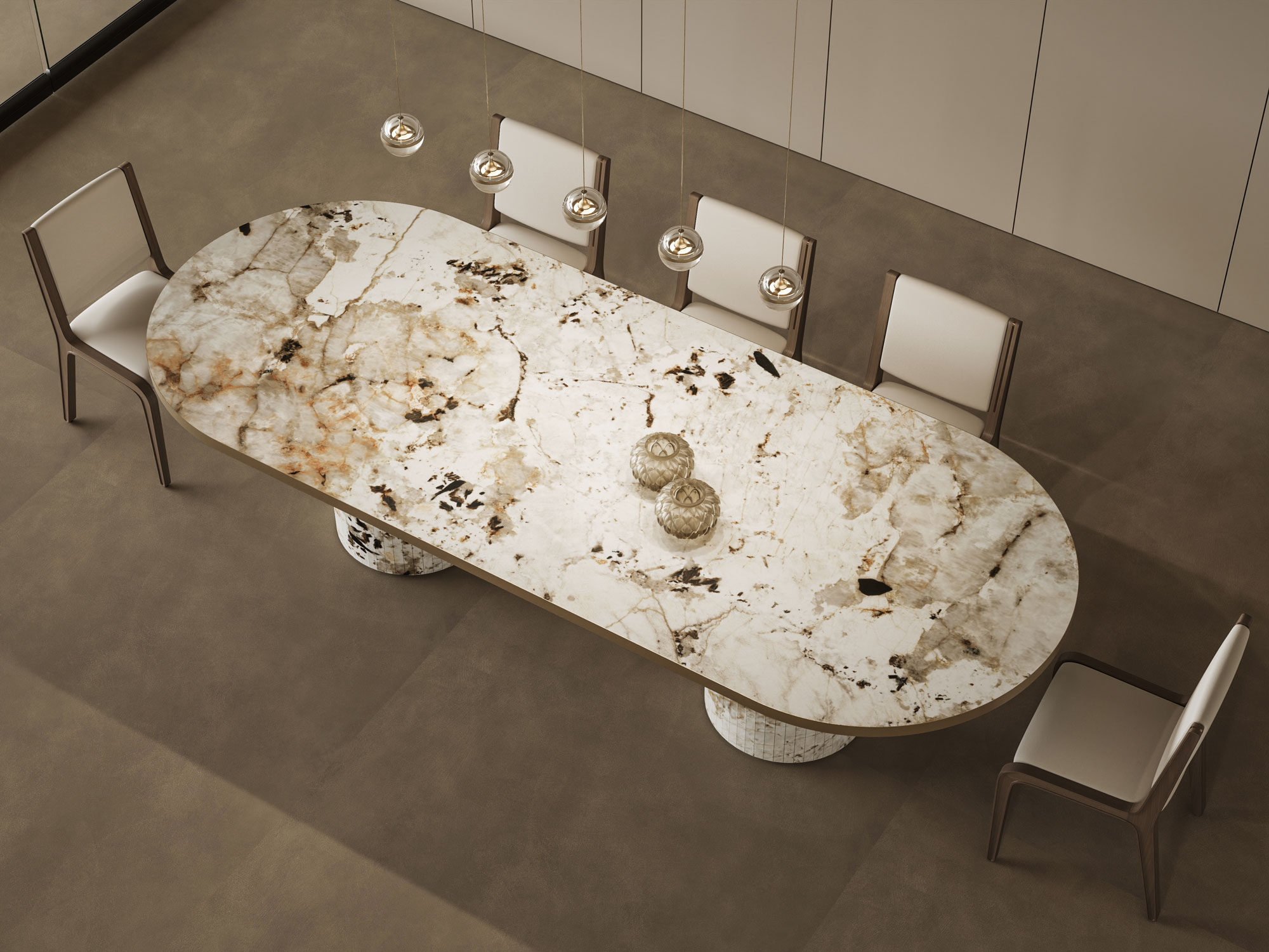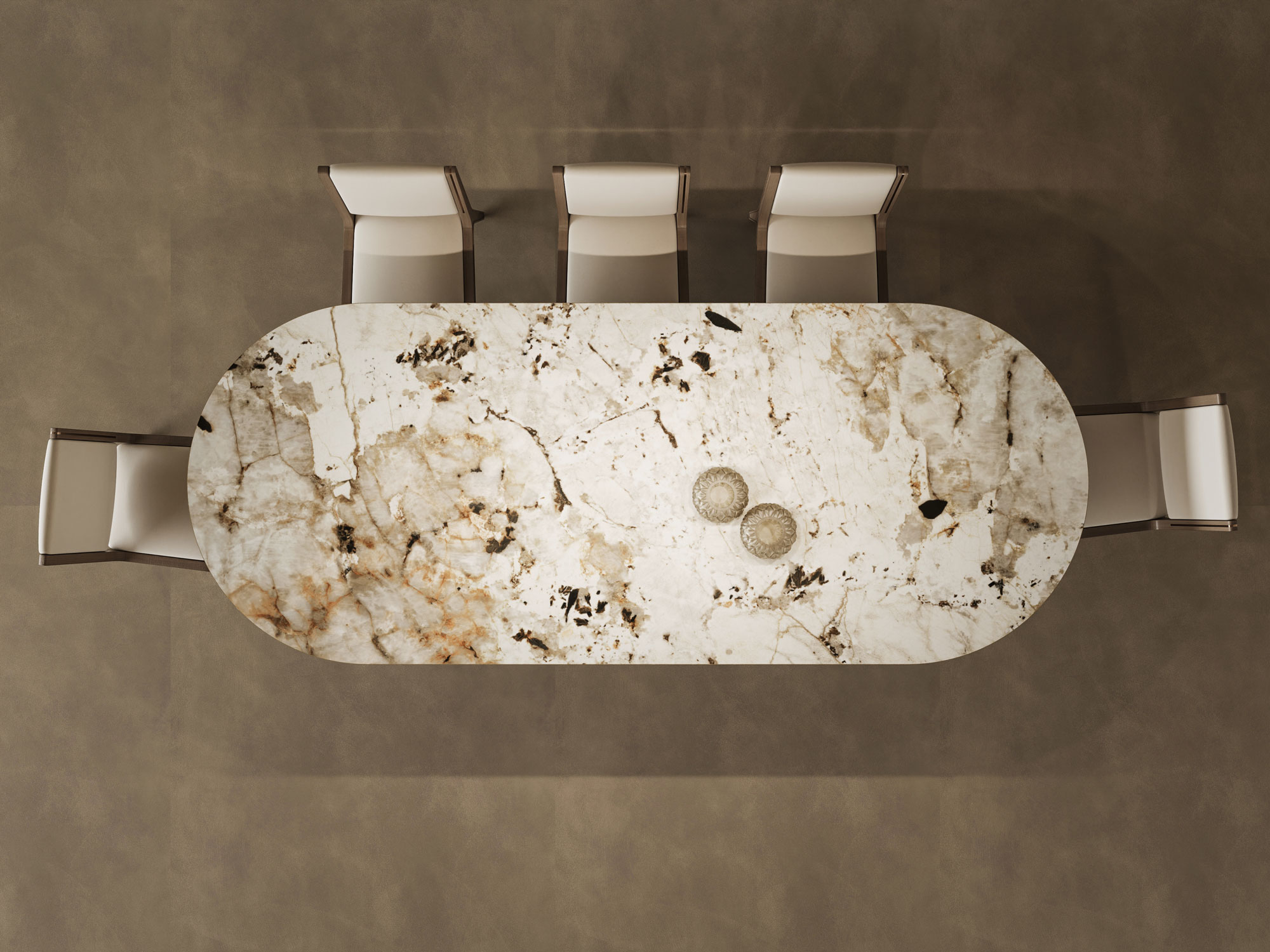 Luxury rounded dining table created from Italian porcelain stoneware, with a metal veneer edge that provides elegant finishing touches. The base features twin columns that bring architectural charm and visual interest to any space. Available in 200x100cm, 220x100cm, 250x110cm, or 300x120cm sizes. Seats 8–12. Choose from marble finishes, including Calacatta and Travertine. Perfect for luxury interiors and high-end dining rooms.