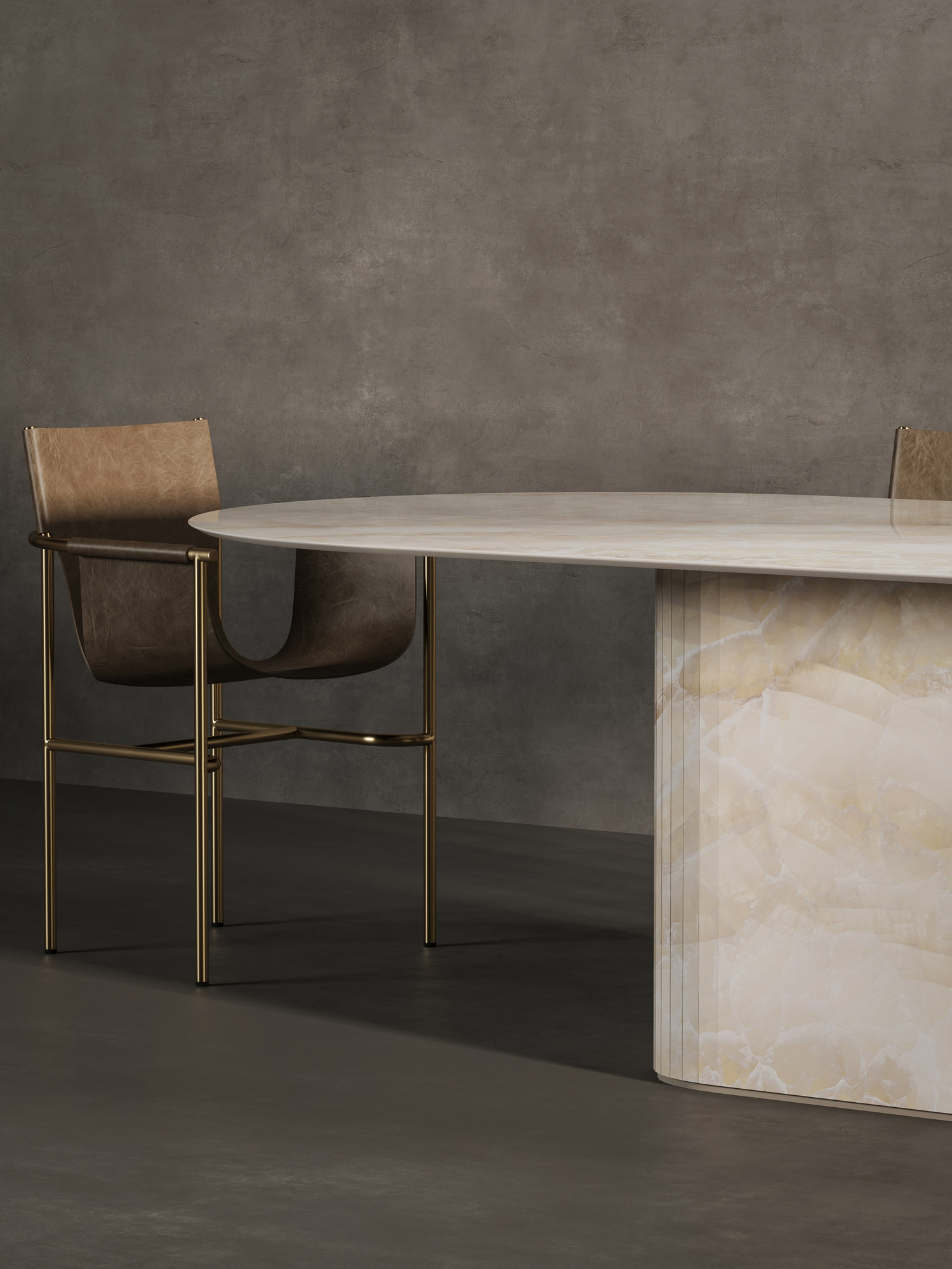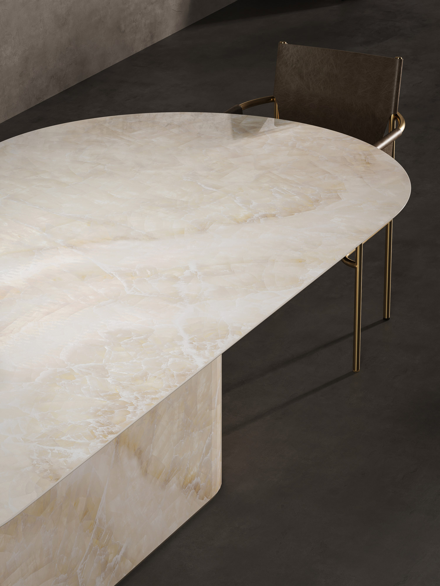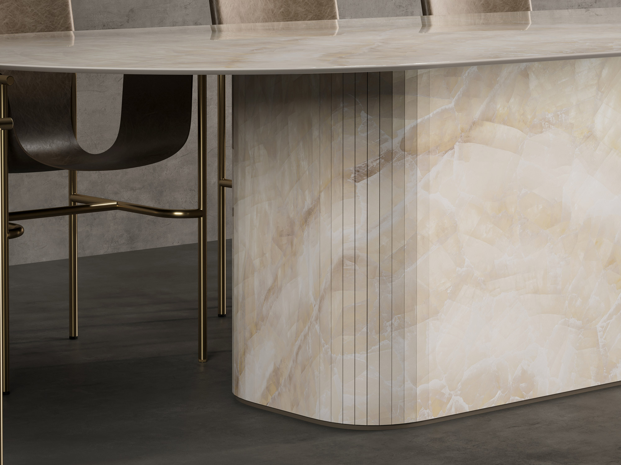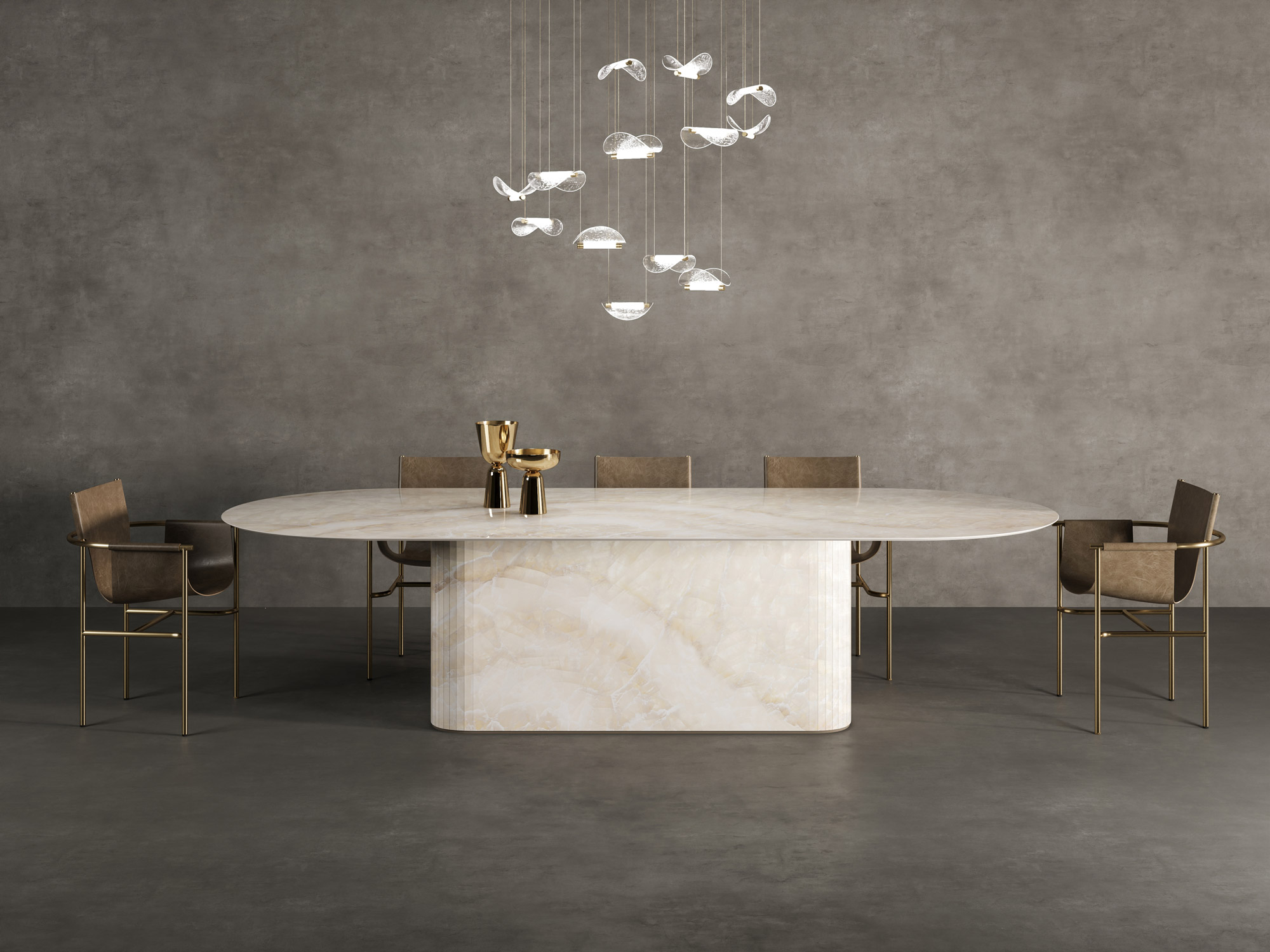 Luxury oval dining table, handcrafted in the UK from premium 12mm Italian porcelain stoneware. Features an elegant pedestal Obelisco base and a sleek stadium shape. Available in four sizes: 200x100cm, 220x100cm, 250x110cm, and 300x120cm. From £4,680. Seats 8–10 guests. Choose from marble finishes, including Calacatta and Travertine. Refined, flowing design for contemporary luxury interiors and statement dining rooms. Individually made to order in 4-6 weeks.