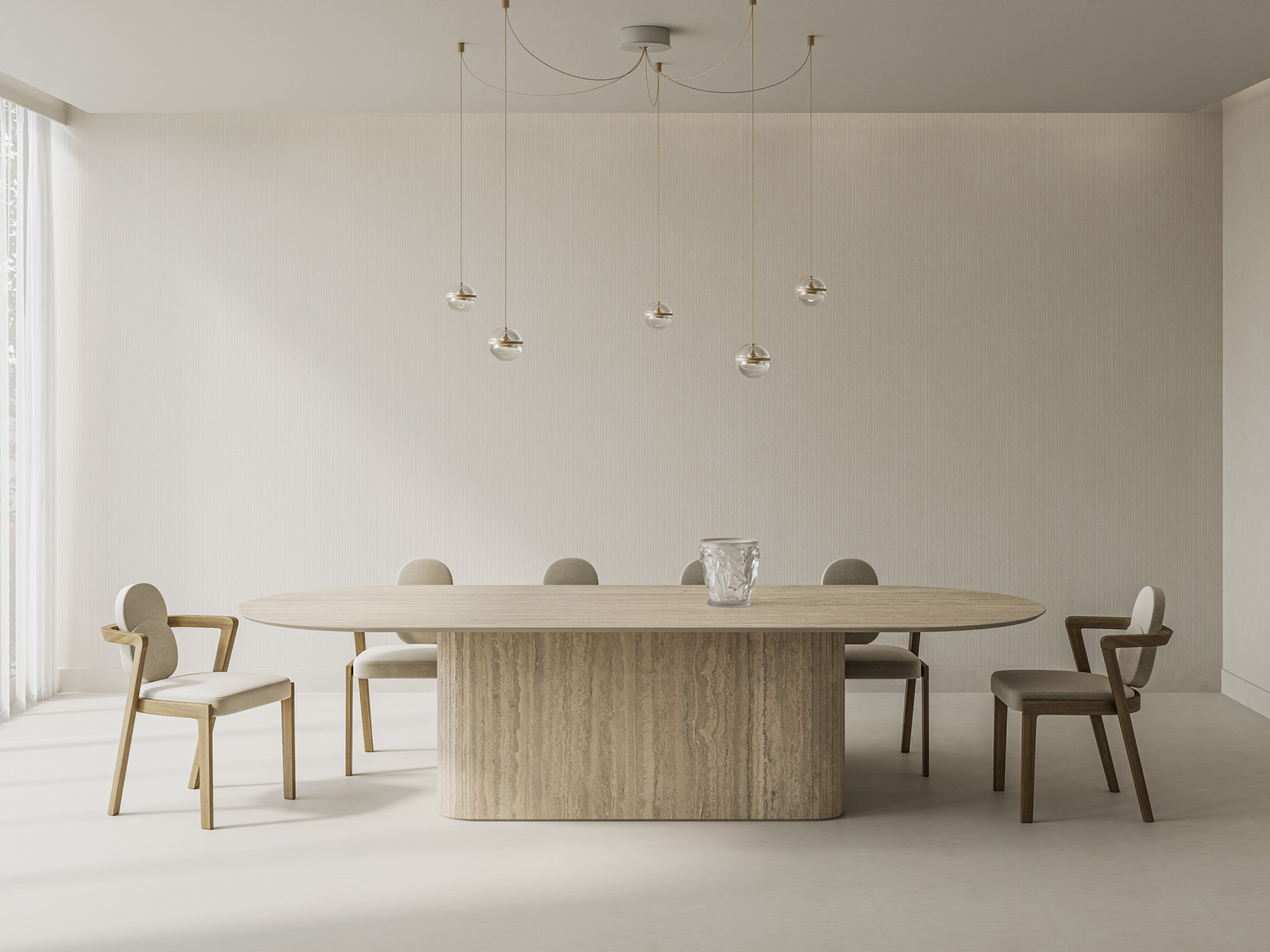 Every table we create is uniquely yours. Choose from our extensive range of porcelain surfaces, from dramatic marble effects to subtle concrete textures, then select the perfect base to complement your style. Whether you prefer the clean lines of our geometric Alveo base, the classical elegance of Colonna columns, or the natural warmth of Romano wood, every element can be tailored to your vision.