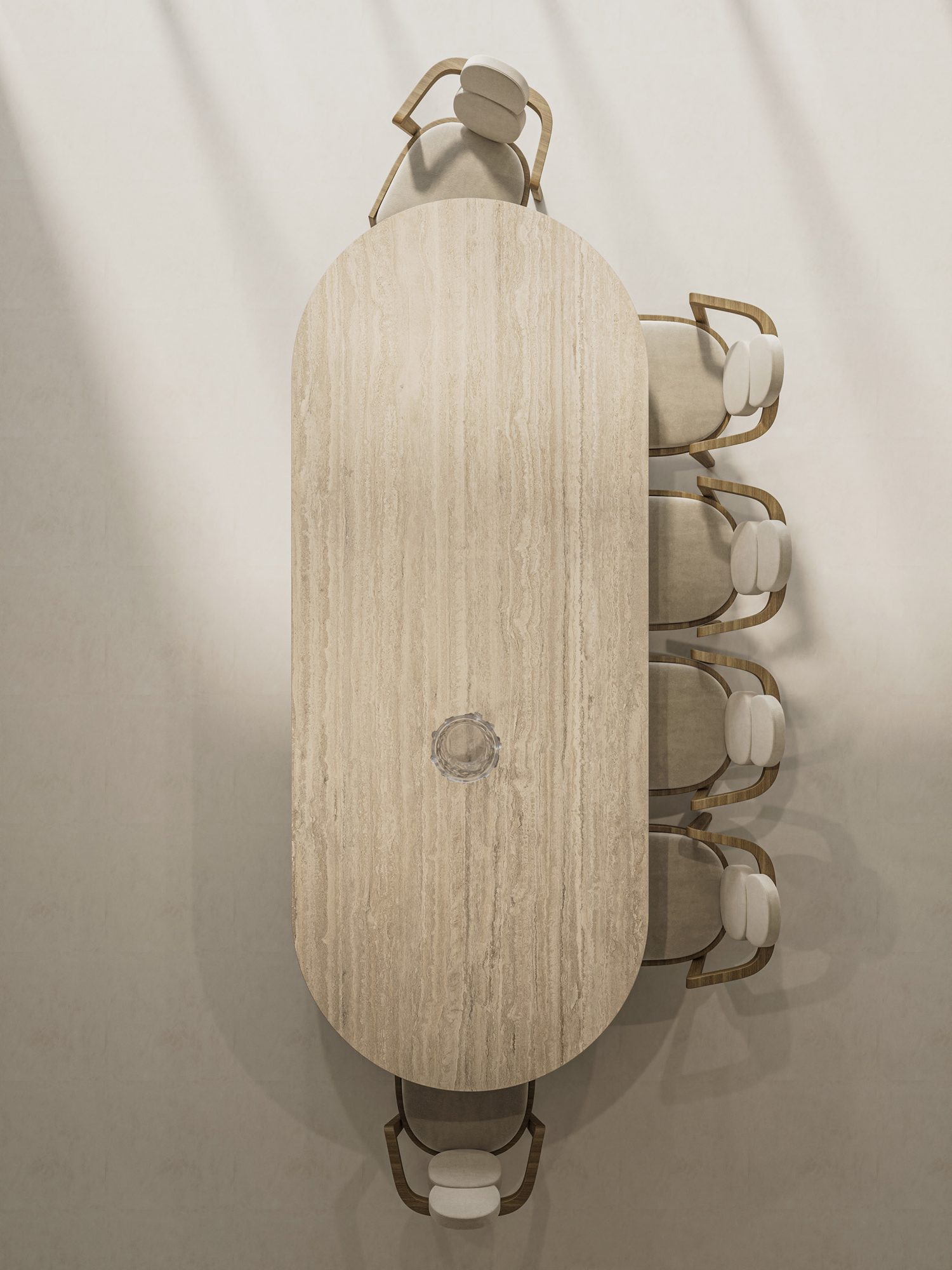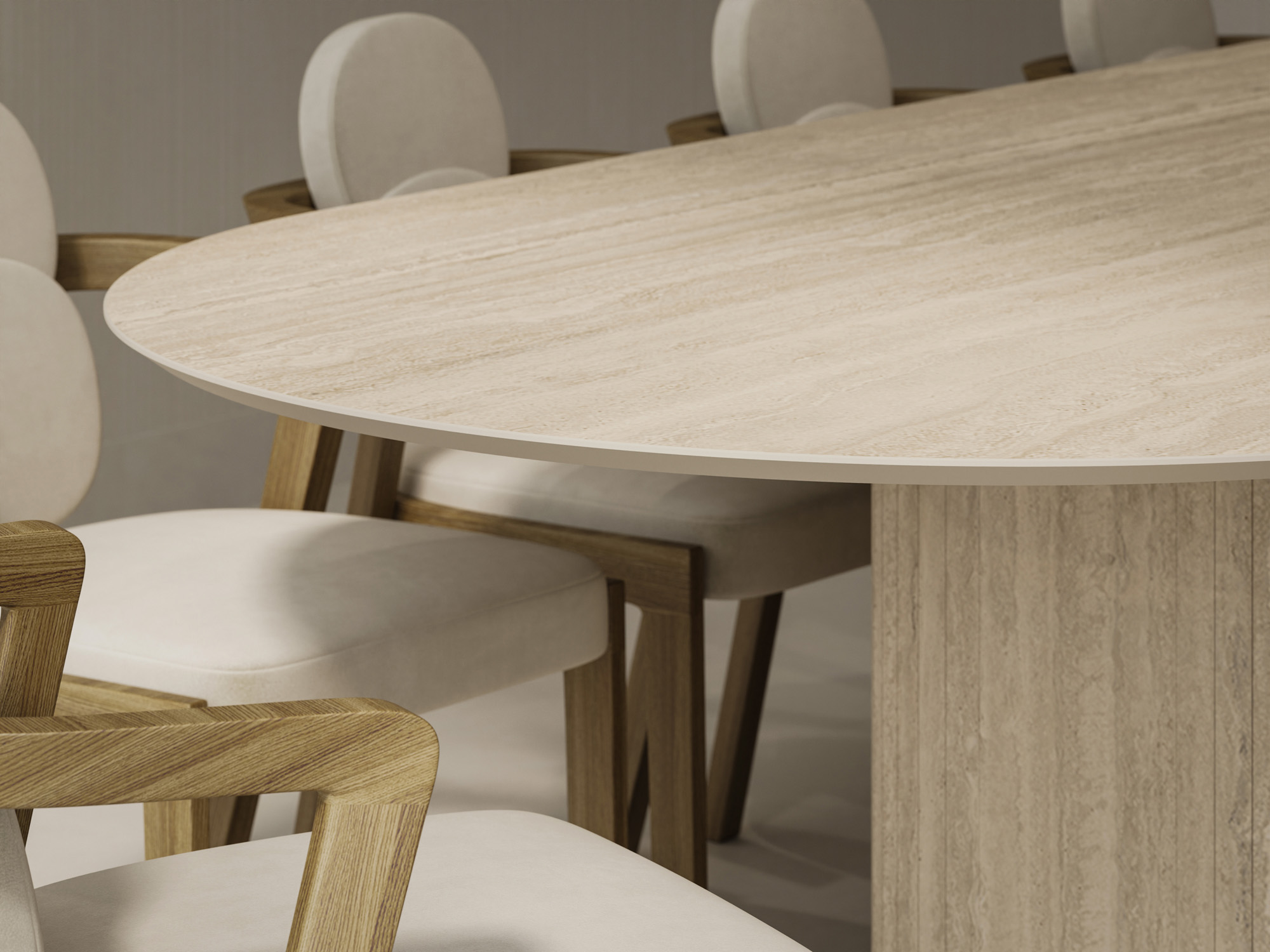 Stadium-shaped luxury dining table manufactured from the finest Italian porcelain stoneware. Shark nose edge profile, paired with pedestal base for a balanced structural presence. Four sizes and surfaces that capture the essence of marble or stone. Handmade-to-order in the UK. Model shown 300 x 120cm seats 10-12.
