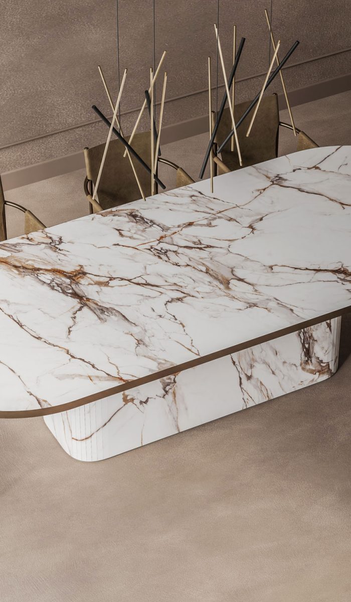 Every table we create is uniquely yours. Choose from our extensive range of porcelain surfaces, from dramatic marble effects to subtle concrete textures, then select the perfect base to complement your style. Whether you prefer the clean lines of our geometric Alveo base, the classical elegance of Colonna columns, or the natural warmth of Romano wood, every element can be tailored to your vision.