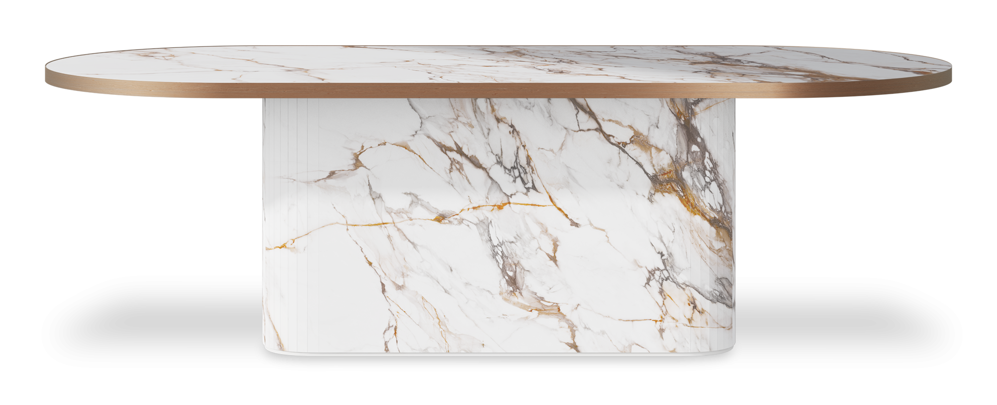 Luxury stadium-shaped dining table with metal veneer edge, handcrafted from premium Italian porcelain stoneware. Sculptural pedestal base provides both stability and visual impact. Available in 200x100cm, 220x100cm, 250x110cm, or 300x120cm sizes to accommodate different dining spaces and seating requirements. Seats 8–12. Choose from marble finishes, including Calacatta and Travertine. Perfect for luxury interiors and high-end dining rooms.