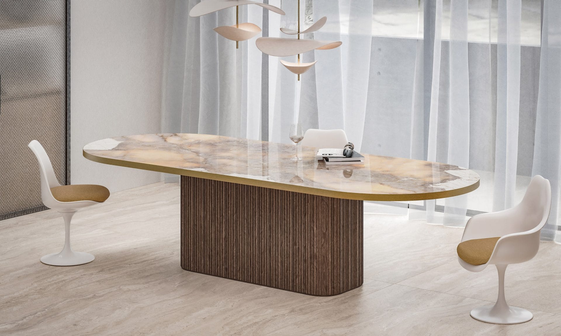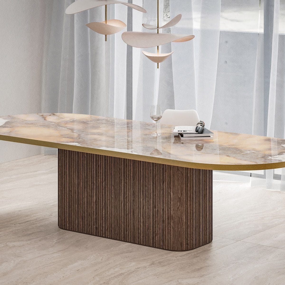 Bespoke luxury dining table, handcrafted in Britain from premium Italian porcelain stoneware, featuring an elegant real wood Pedestal Obelisco base and metal edge veneer. The stadium shape maximises seating space and conversation comfort. Available in 200x100cm, 220x100cm, 250x110cm, and 300x120cm sizes. Seats 8–12. Available in a variety of tops and 2 options for the real wood base. Choose from authentic marble and stone-effect finishes, including Arabescato, Calacatta and Travertine. Perfect for high-end interiors, statement dining rooms, and contemporary luxury spaces.