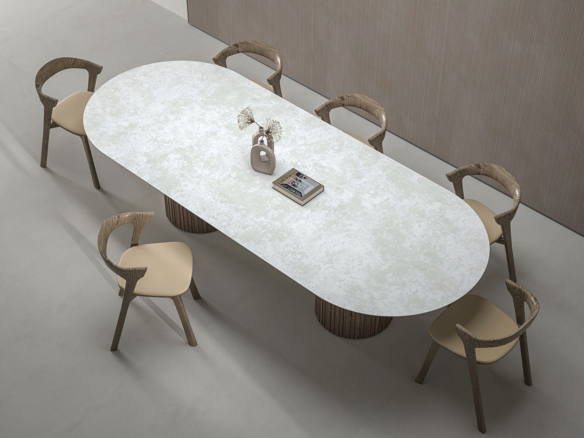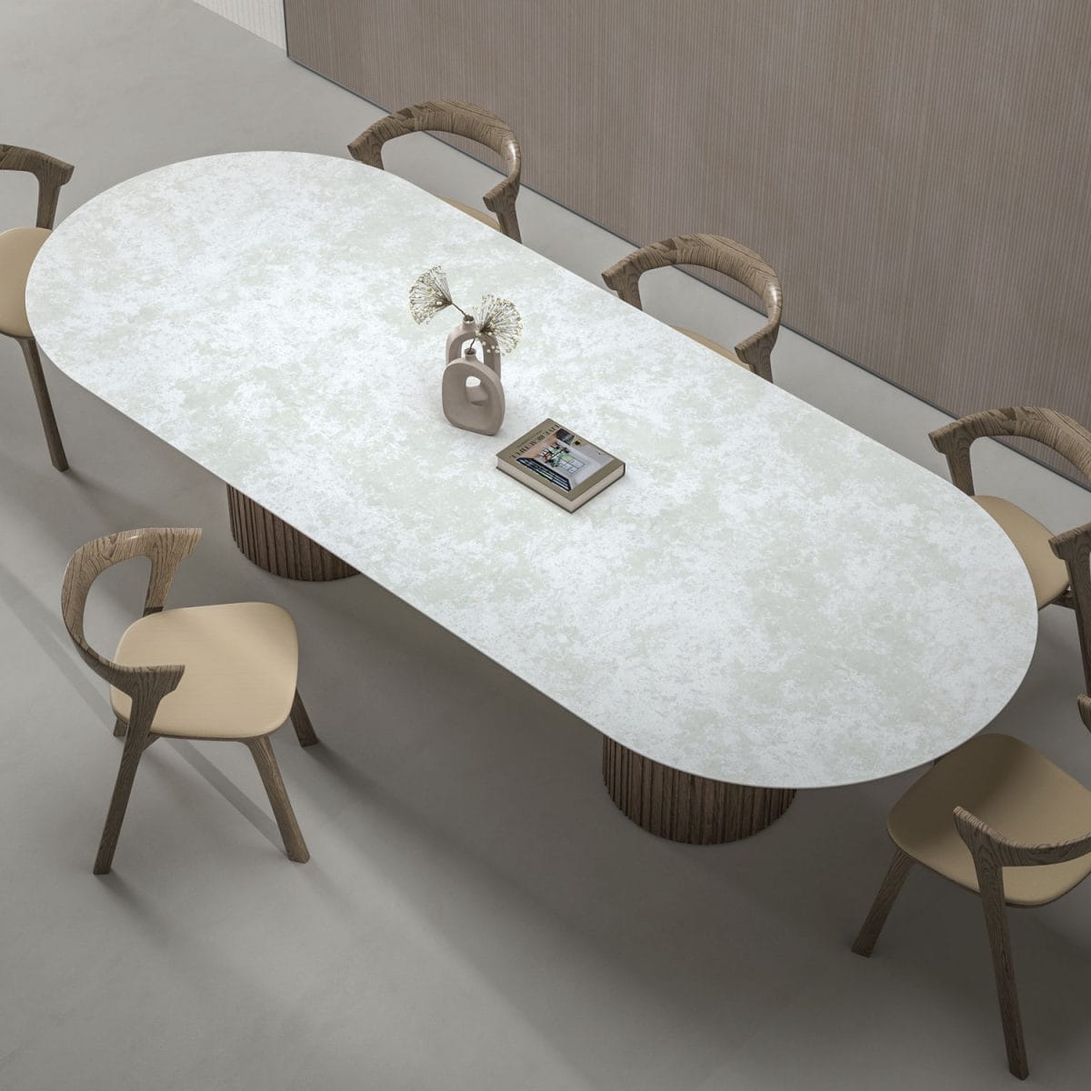 Luxury oval dining table handcrafted in Britain from premium 20mm Italian porcelain stoneware with twin column real wood base. Features a special shark nose edge profile, balanced proportions, and marble finish. Available in 200x100cm, 220x100cm, 250x110cm, or 300x120cm. Seats 8–12. Choose from 10 finishes, including marble and stone effects such as Calacatta, Travertine, and Statuario. Designed for luxury interiors and statement dining spaces. Model shown 300 x 120cm.