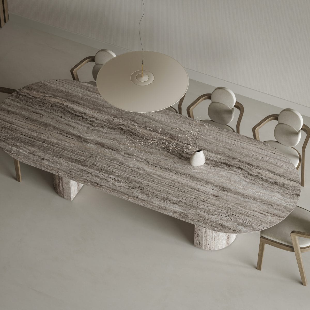 Luxury stadium-shaped dining table made from the finest Italian porcelain stoneware. The refined shark nose edge provides a sophisticated finish, while the sleek 12mm profile delivers both elegance and durability. Twin semicircular base create a beautiful architectural statement. Available in 200x100cm, 220x100cm, 250x110cm, or 300x120cm sizes. Seats 8–12. Choose from marble finishes, including Calacatta and Travertine. Perfect for luxury interiors and high-end dining rooms.