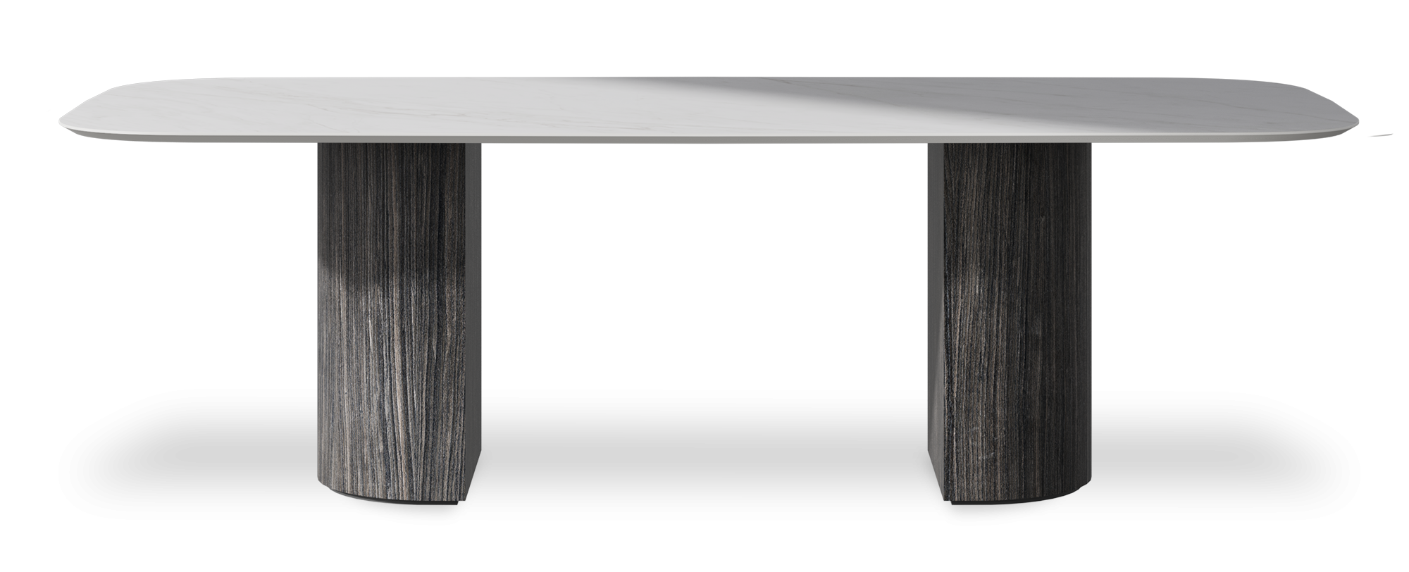 Luxury stadium-shaped top crafted from premium Italian porcelain stoneware. Features a special shark nose edge and a 20mm thickness. The table sits on twin semicircular bases that create an eye-catching architectural foundation. Available in 200x100cm, 220x100cm, 250x110cm, or 300x120cm sizes. Seats 8–12. Choose from marble finishes, including Calacatta and Travertine. Perfect for luxury interiors and high-end dining rooms.