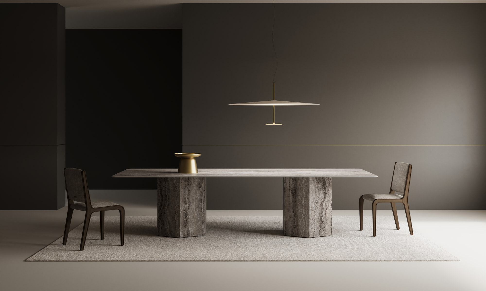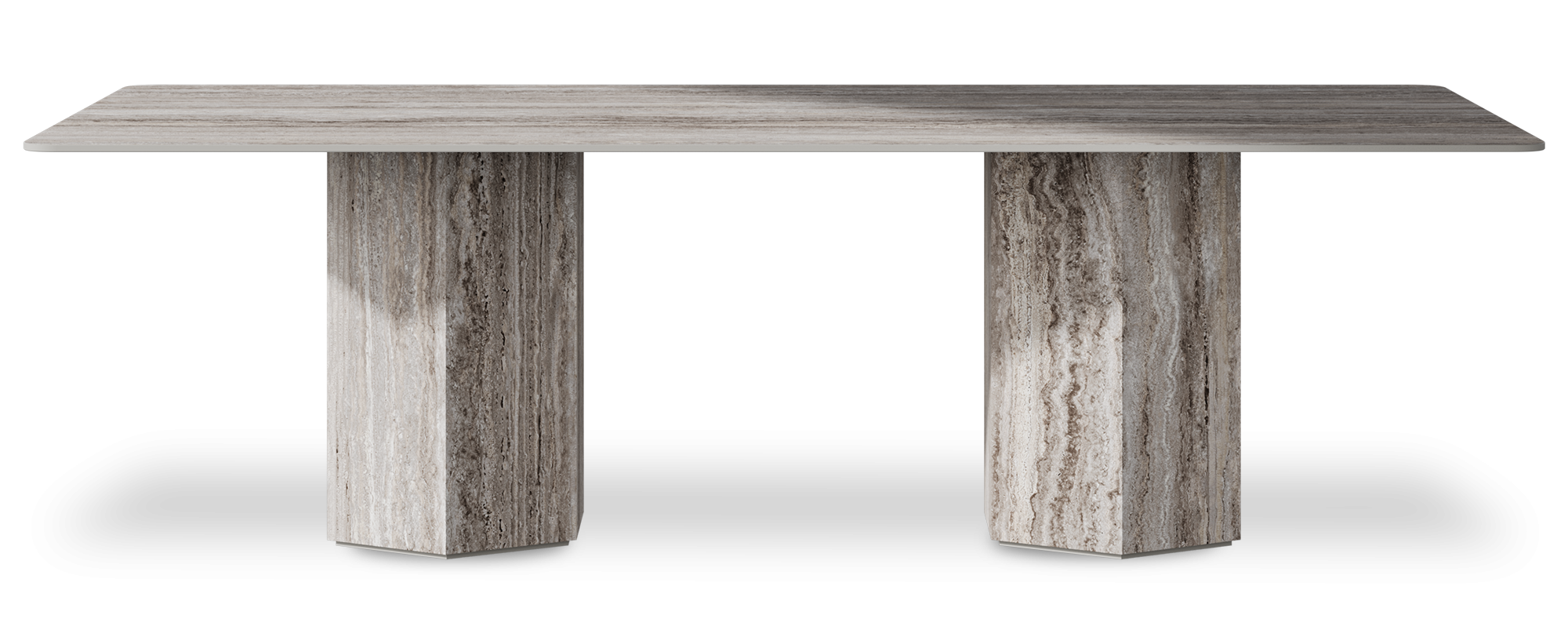 Luxury rectangular dining table with 12mm porcelain top, handcrafted from premium Italian porcelain stoneware. Twin hexagon base supports a sculptural form. Double pencil edge profile defines its elegant line. Available in 200x100cm, 220x100cm, 250x110cm, or 300x120cm sizes. Seats 8–12. Choose from marble finishes, including Calacatta and Travertine. Perfect for luxury interiors and high-end dining rooms. Model shown 300×120.