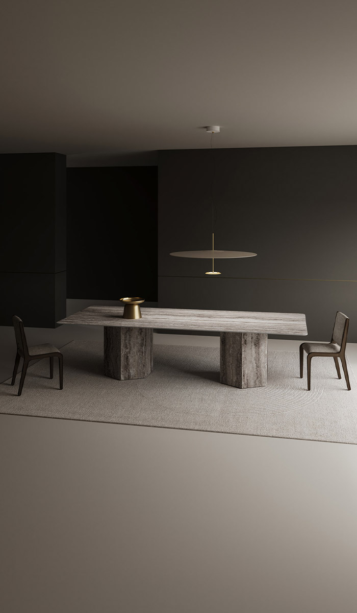 Every table we create is uniquely yours. Choose from our extensive range of porcelain surfaces, from dramatic marble effects to subtle concrete textures, then select the perfect base to complement your style. Whether you prefer the clean lines of our geometric Alveo base, the classical elegance of Colonna columns, or the natural warmth of Romano wood, every element can be tailored to your vision.