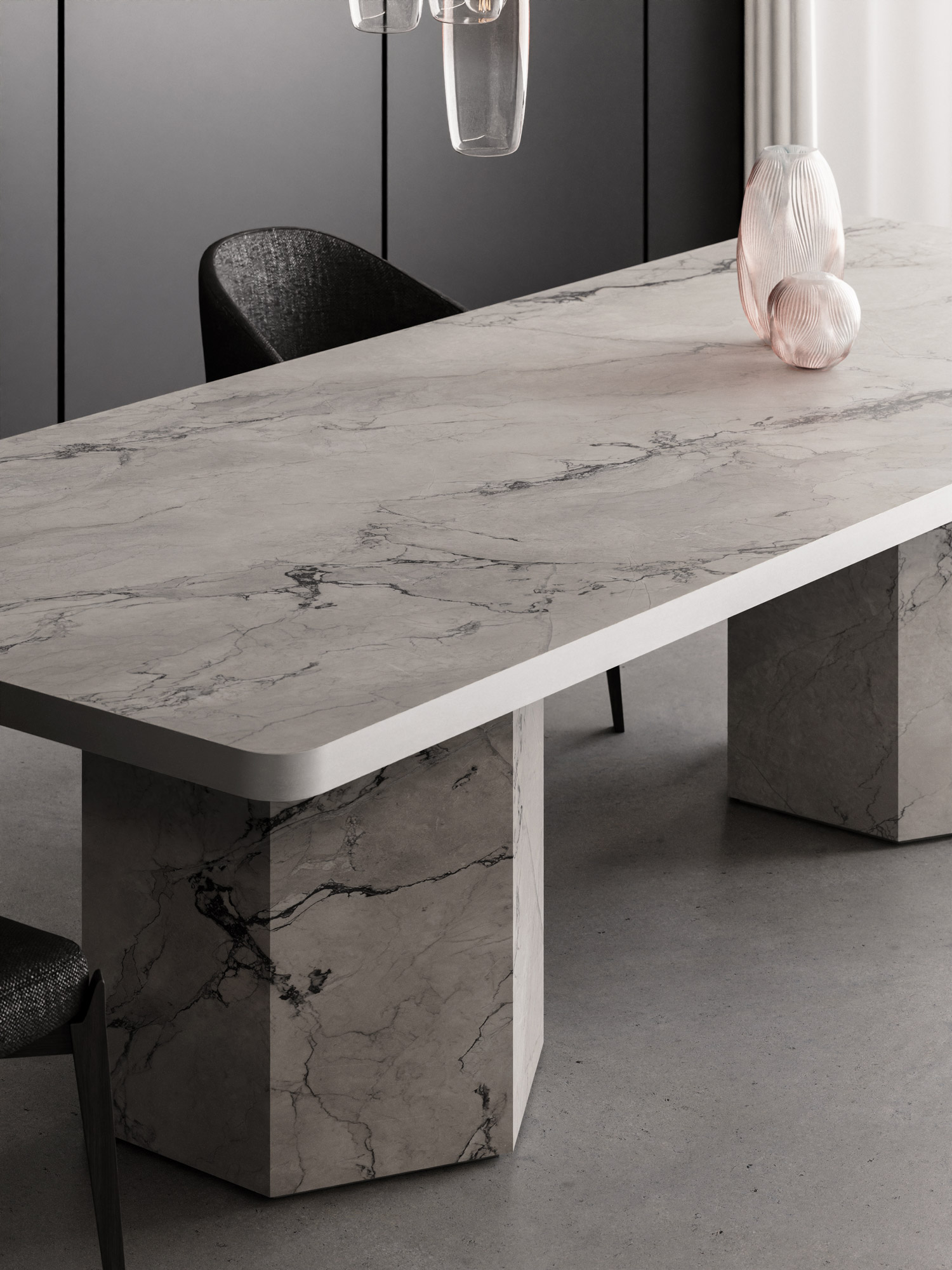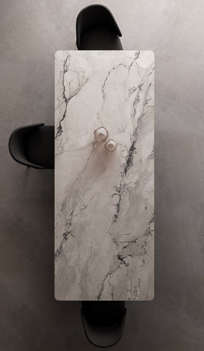 Every table we create is uniquely yours. Choose from our extensive range of porcelain surfaces, from dramatic marble effects to subtle concrete textures, then select the perfect base to complement your style. Whether you prefer the clean lines of our geometric Alveo base, the classical elegance of Colonna columns, or the natural warmth of Romano wood, every element can be tailored to your vision.