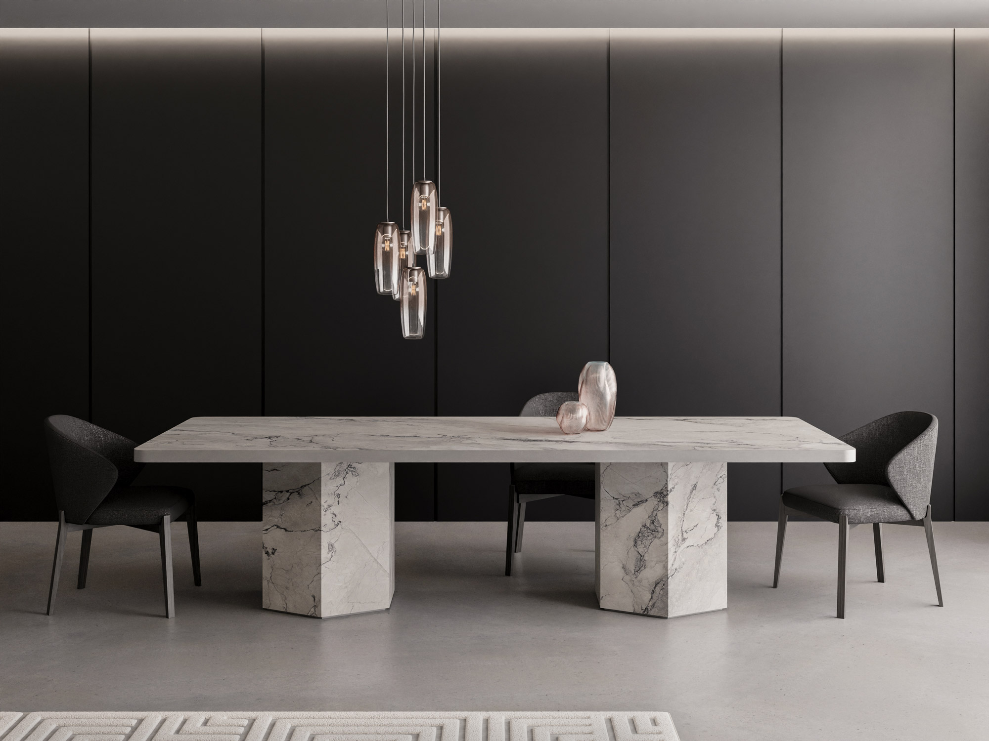 Luxury rectangular dining table with metal edge veneer, handcrafted from premium Italian porcelain stoneware. Twin hexagon base supports a sculptural form. Available in 200x100cm, 220x100cm, 250x110cm, or 300x120cm sizes. Seats 8–12. Choose from marble finishes, including Calacatta and Travertine. Perfect for luxury interiors and high-end dining rooms. Model shown 300×120.