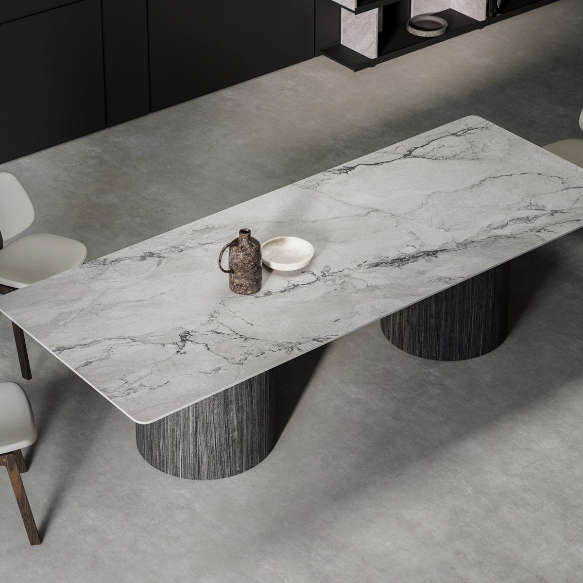 Every table we create is uniquely yours. Choose from our extensive range of porcelain surfaces, from dramatic marble effects to subtle concrete textures, then select the perfect base to complement your style. Whether you prefer the clean lines of our geometric Alveo base, the classical elegance of Colonna columns, or the natural warmth of Romano wood, every element can be tailored to your vision.