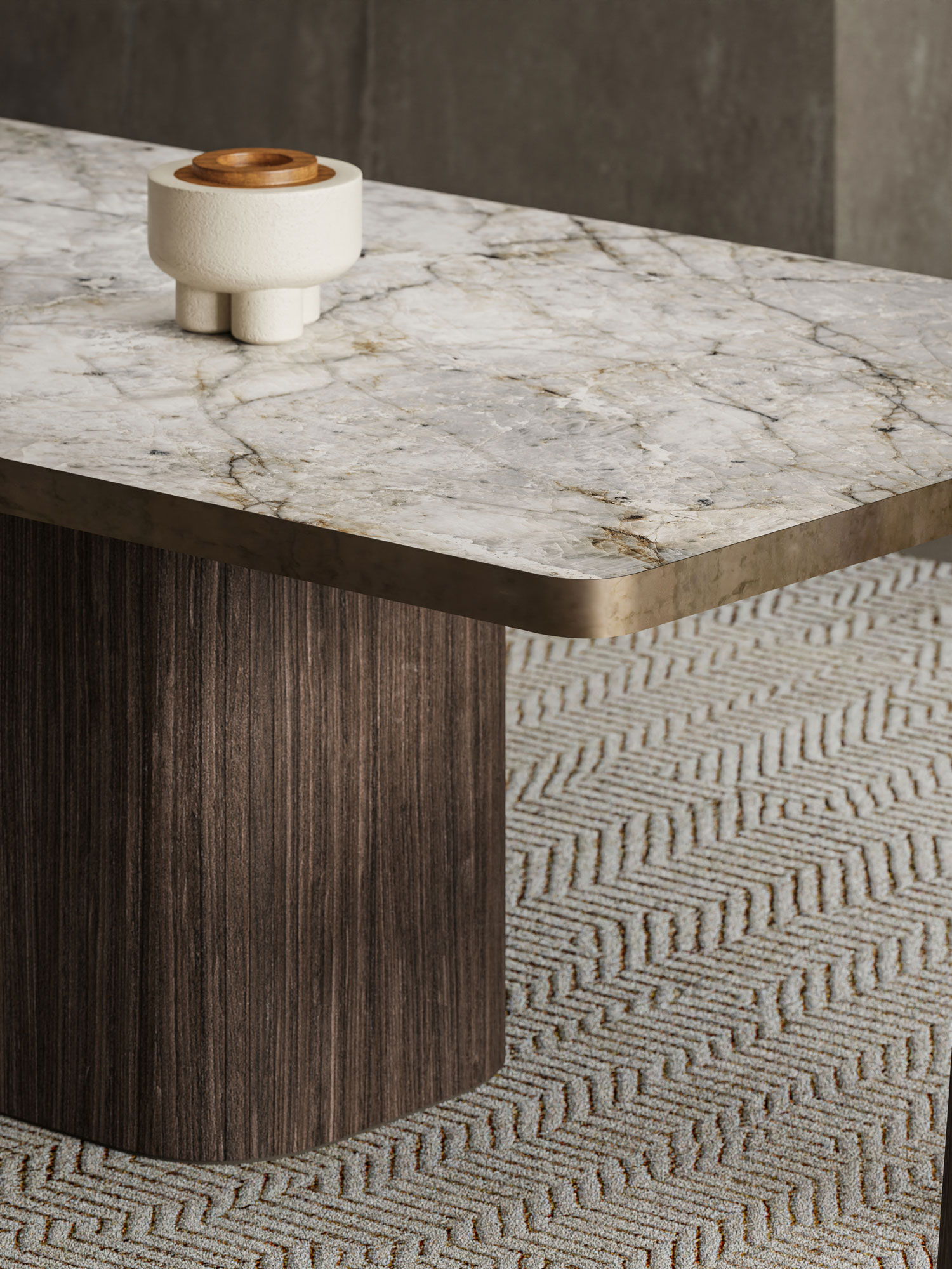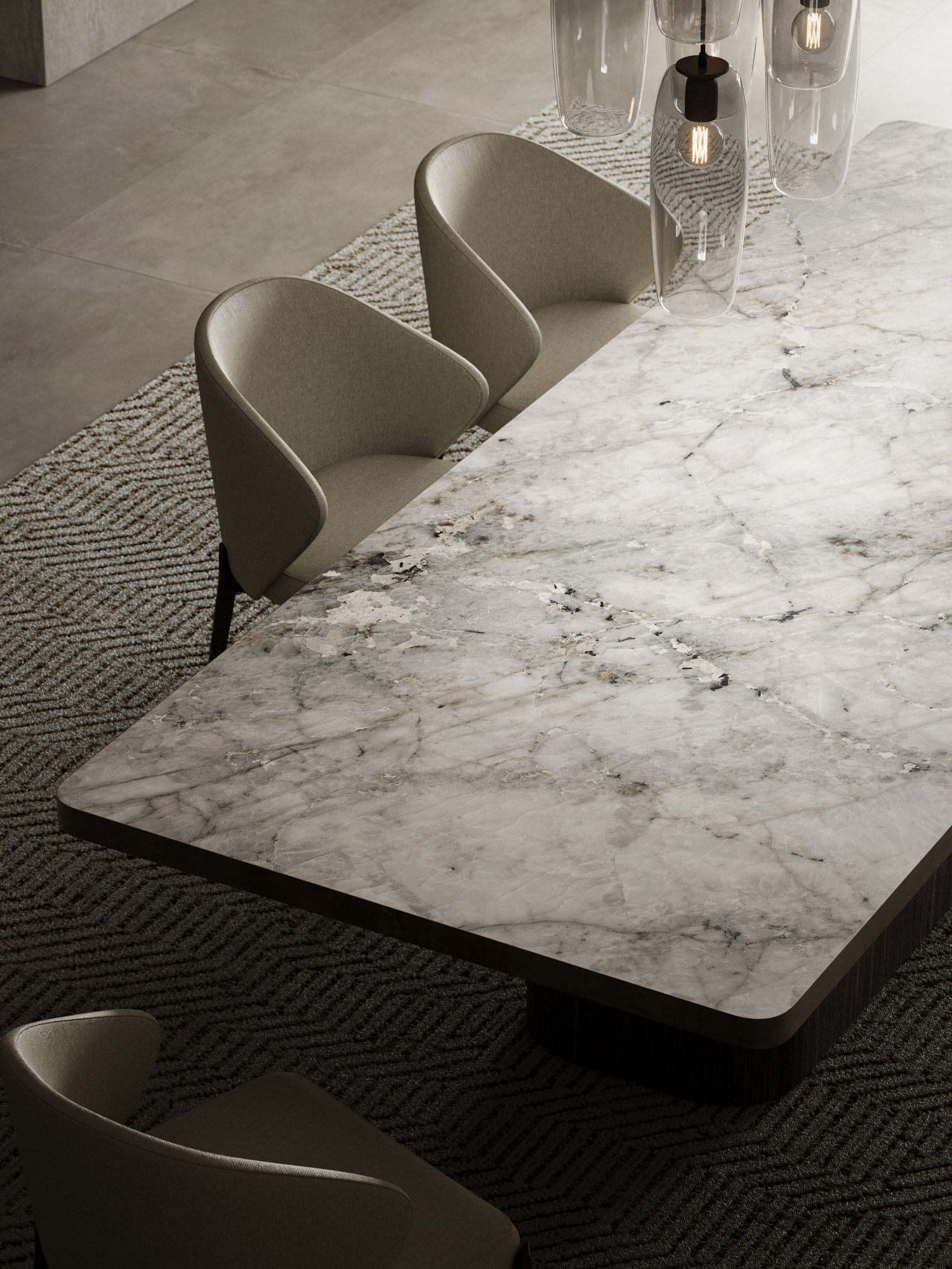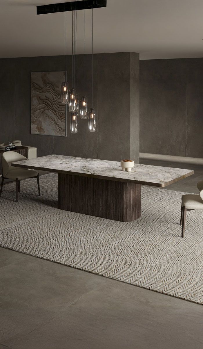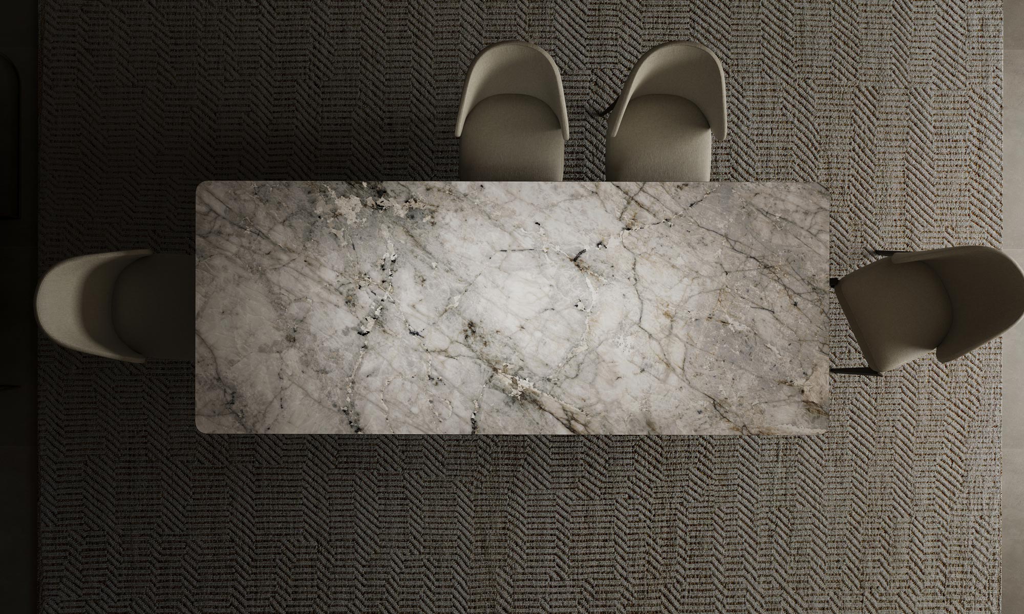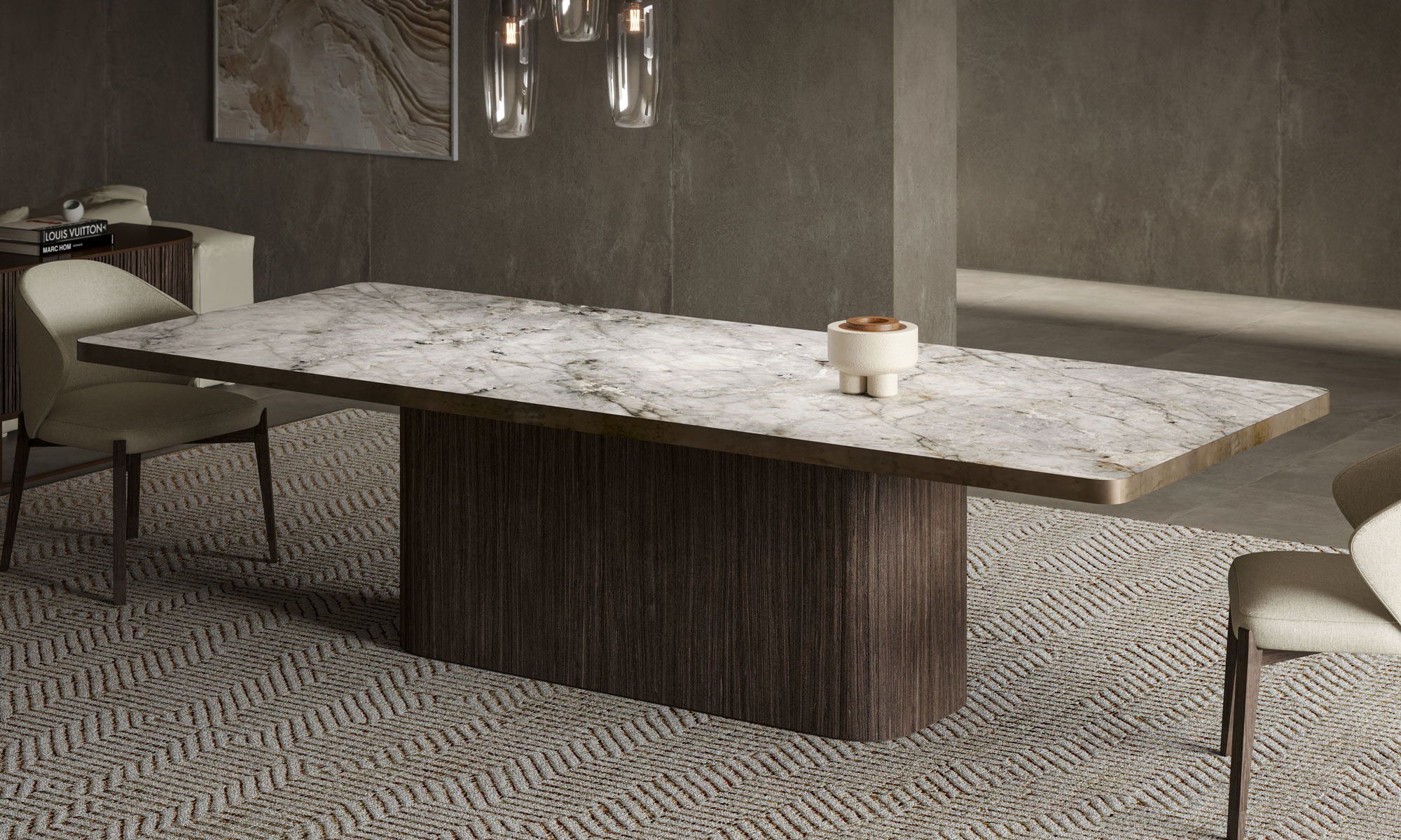 Every table we create is uniquely yours. Choose from our extensive range of porcelain surfaces, from dramatic marble effects to subtle concrete textures, then select the perfect base to complement your style. Whether you prefer the clean lines of our geometric Alveo base, the classical elegance of Colonna columns, or the natural warmth of Romano wood, every element can be tailored to your vision.