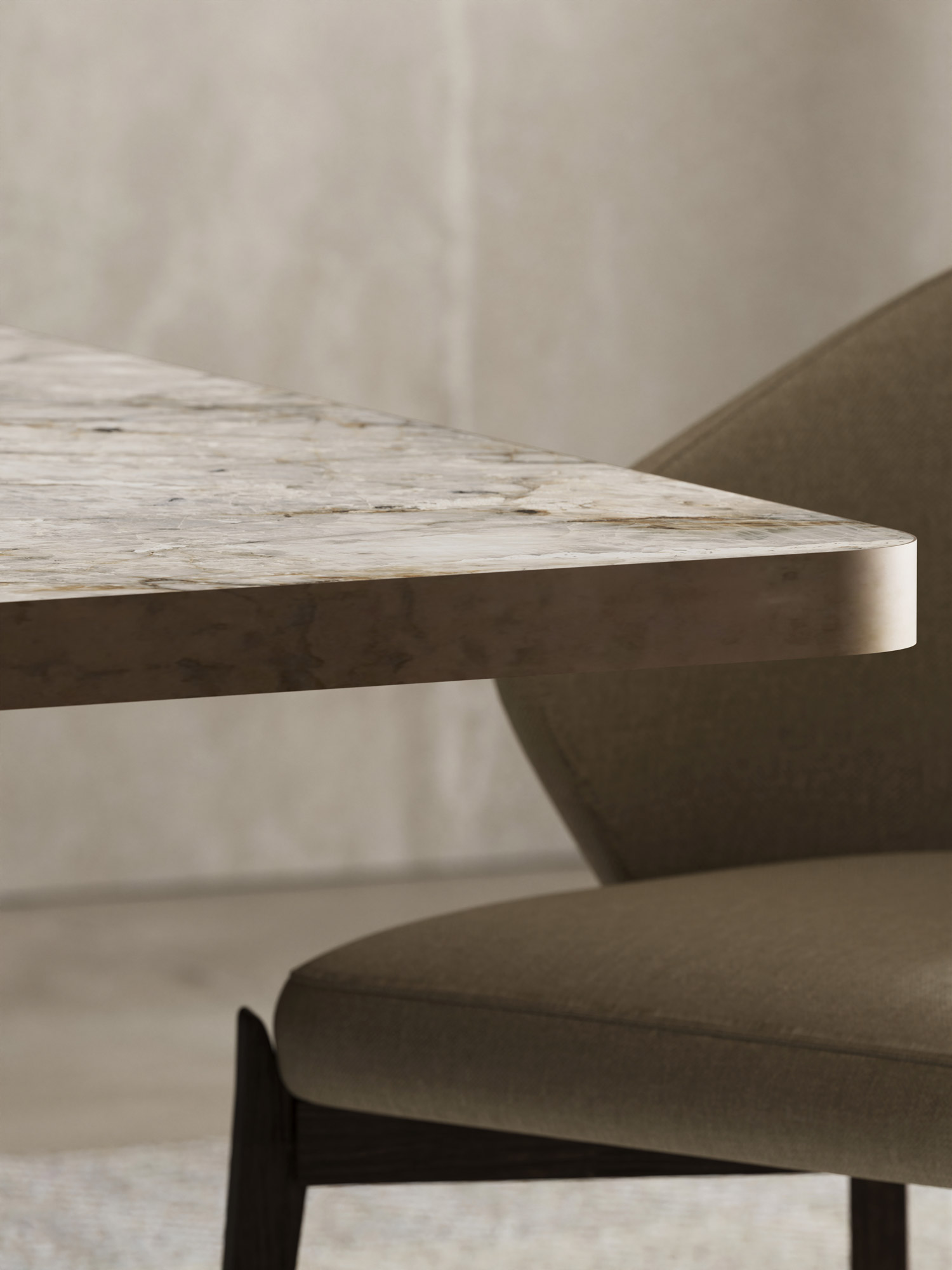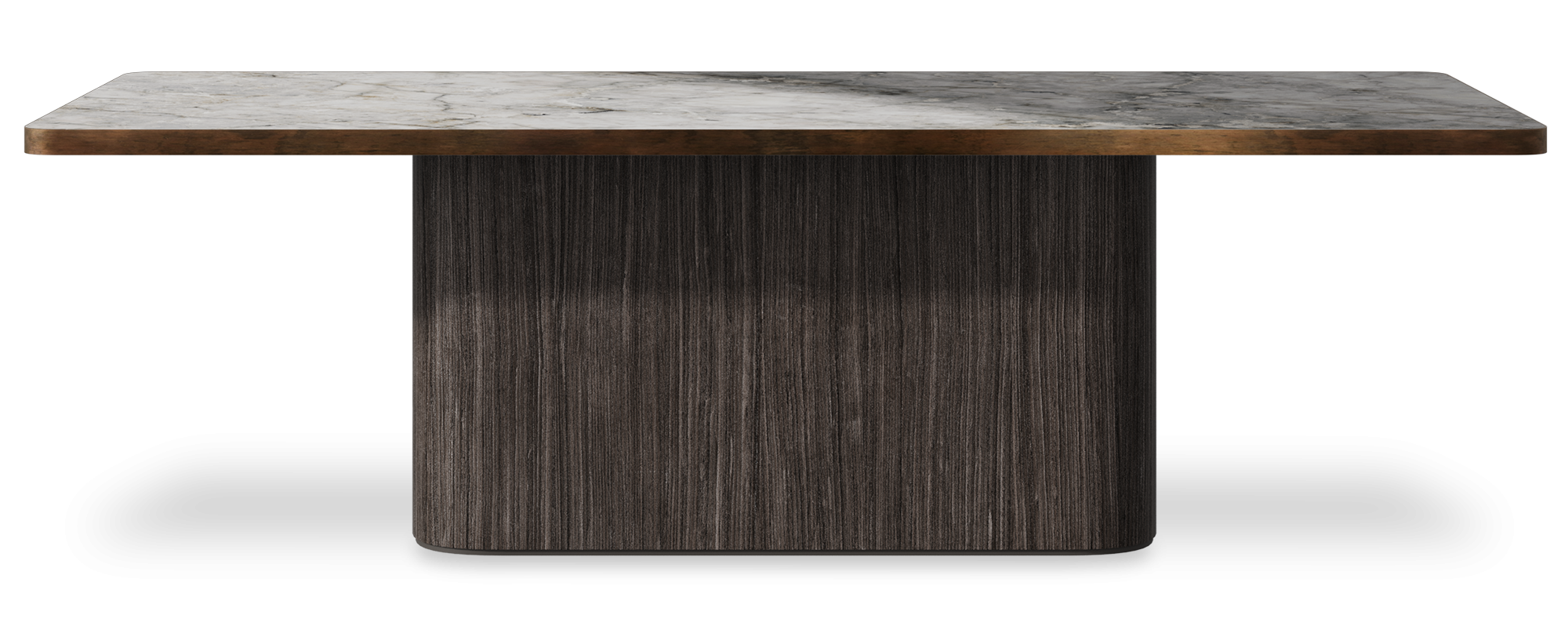 Bespoke luxury dining table handcrafted in Britain from premium Italian porcelain stoneware with an elegant Pedestal Obelisco base, furnished with metal edge veneer. The rectangular shape maximises seating space and conversation comfort. Available in 200x100cm, 220x100cm, 250x110cm, and 300x120cm sizes. Seats 8–12. Choose from authentic marble and stone-effect finishes, including Arabescato, Calacatta and Travertine. Perfect for high-end interiors, statement dining rooms, and contemporary luxury spaces.