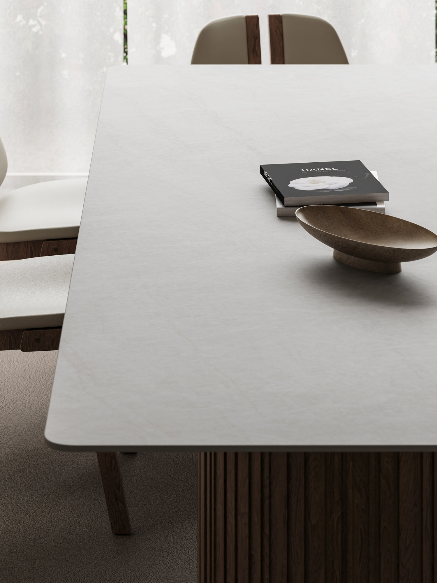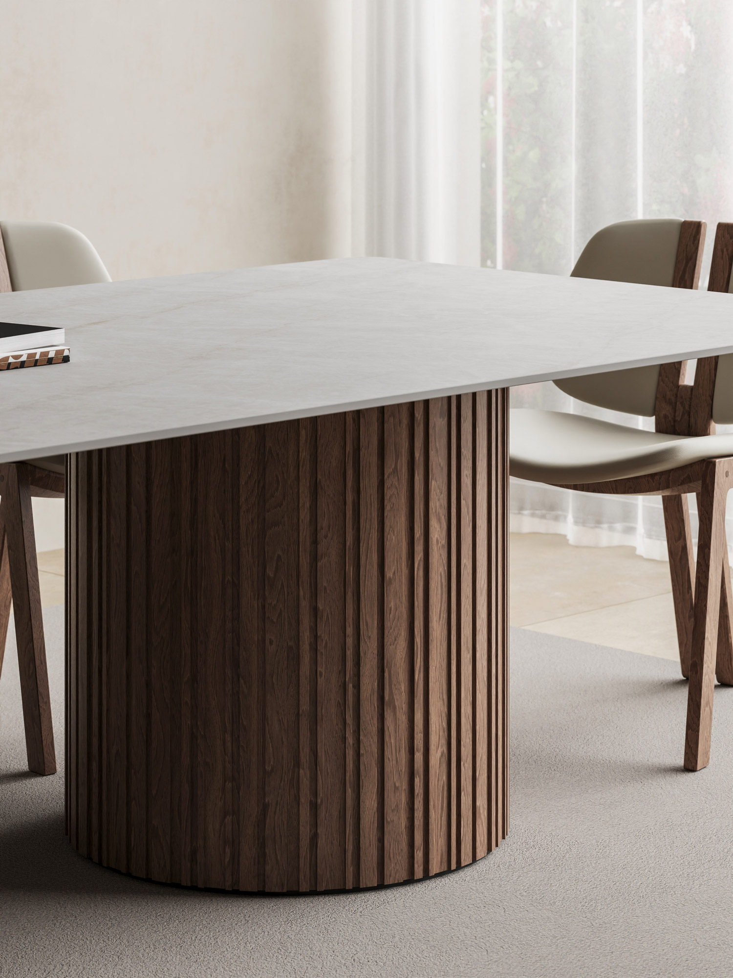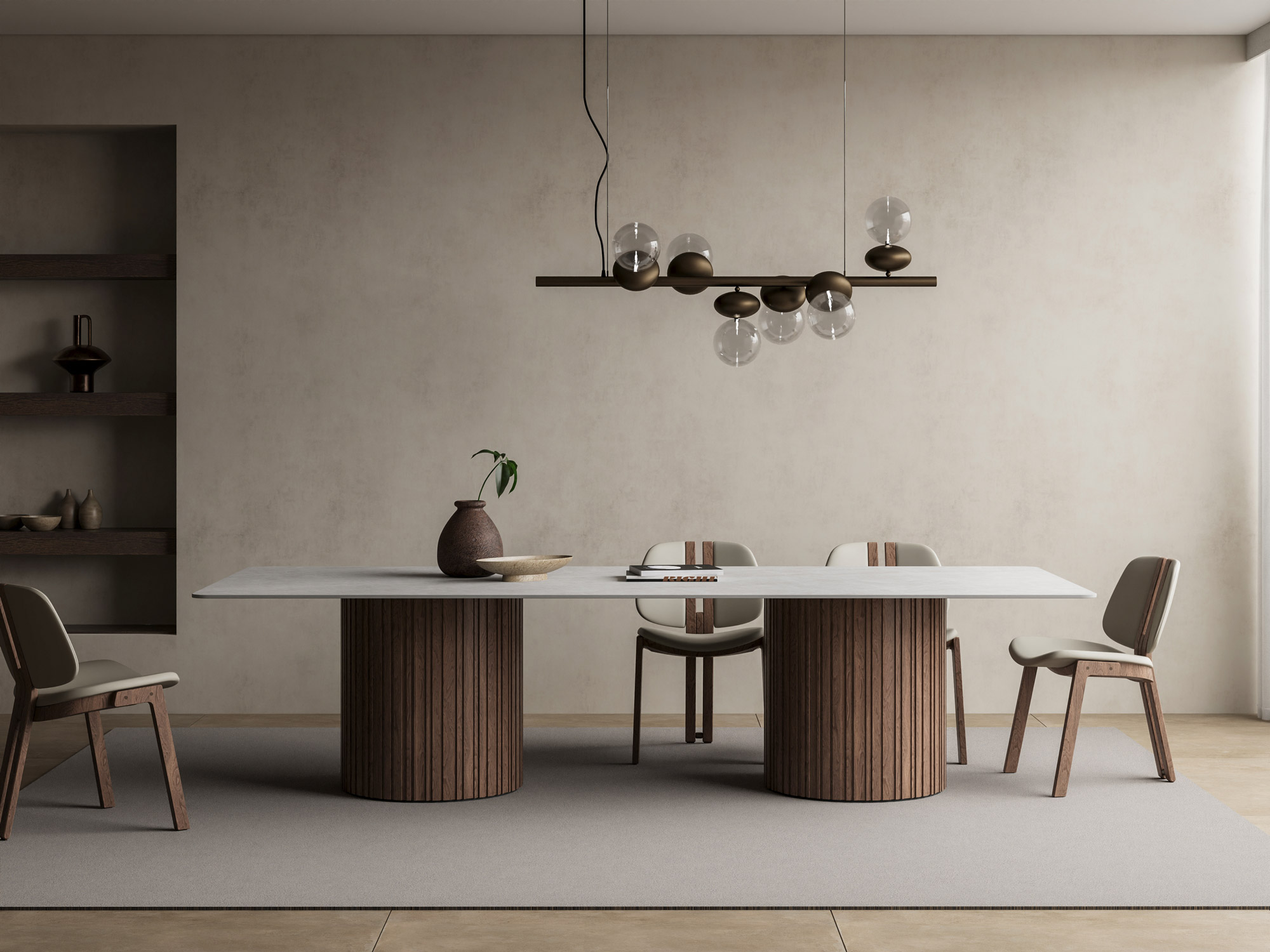 Luxury rectangular top crafted from premium Italian porcelain stoneware, featuring an elegant double pencil edge and 12mm thickness. Stands on a twin base offering 2 wooden options. Available in 200x100cm, 220x100cm, 250x110cm, or 300x120cm sizes. Seats 8–12. Choose from marble finishes, including Calacatta and Travertine. Perfect for luxury interiors and high-end dining rooms.