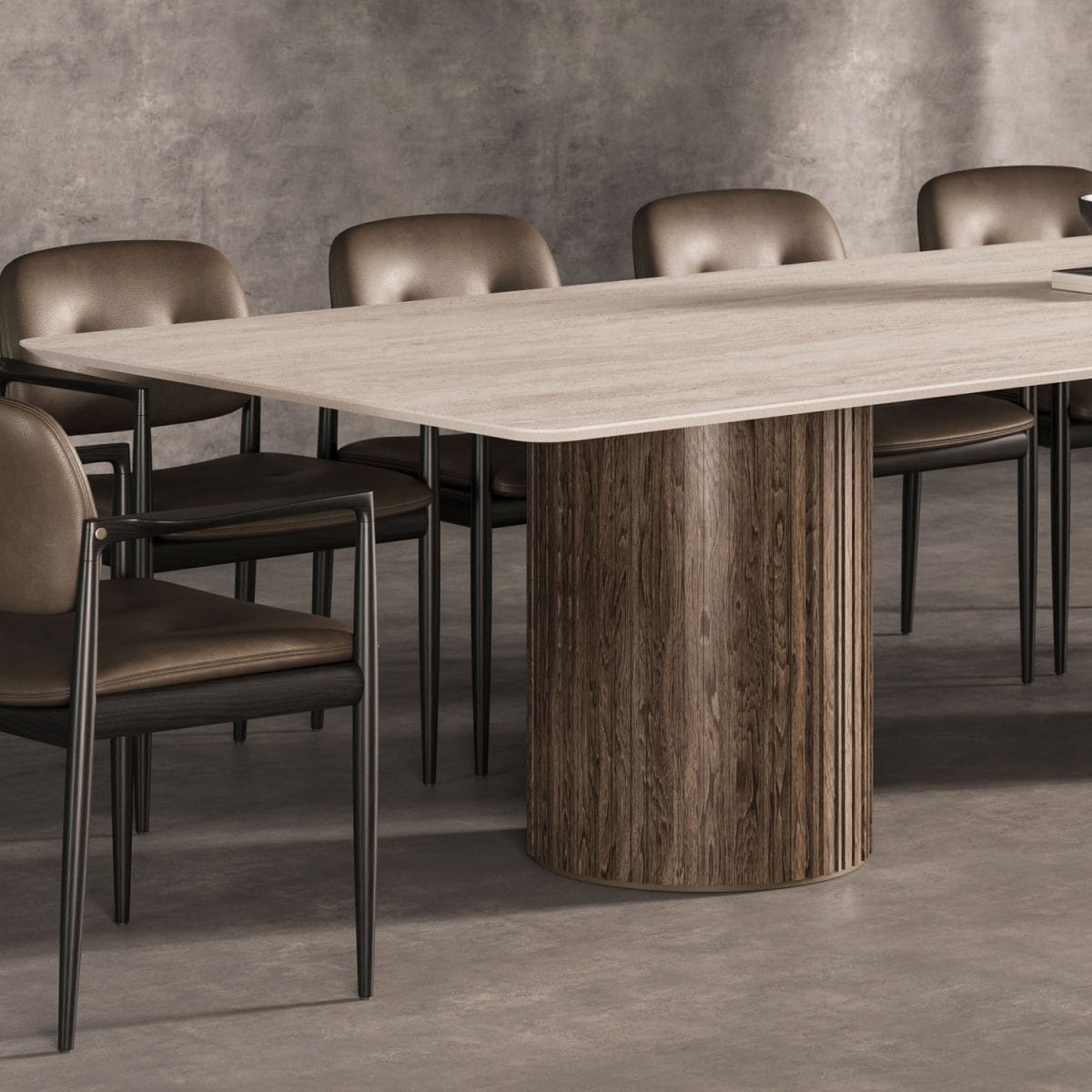 Every table we create is uniquely yours. Choose from our extensive range of porcelain surfaces, from dramatic marble effects to subtle concrete textures, then select the perfect base to complement your style. Whether you prefer the clean lines of our geometric Alveo base, the classical elegance of Colonna columns, or the natural warmth of Romano wood, every element can be tailored to your vision.