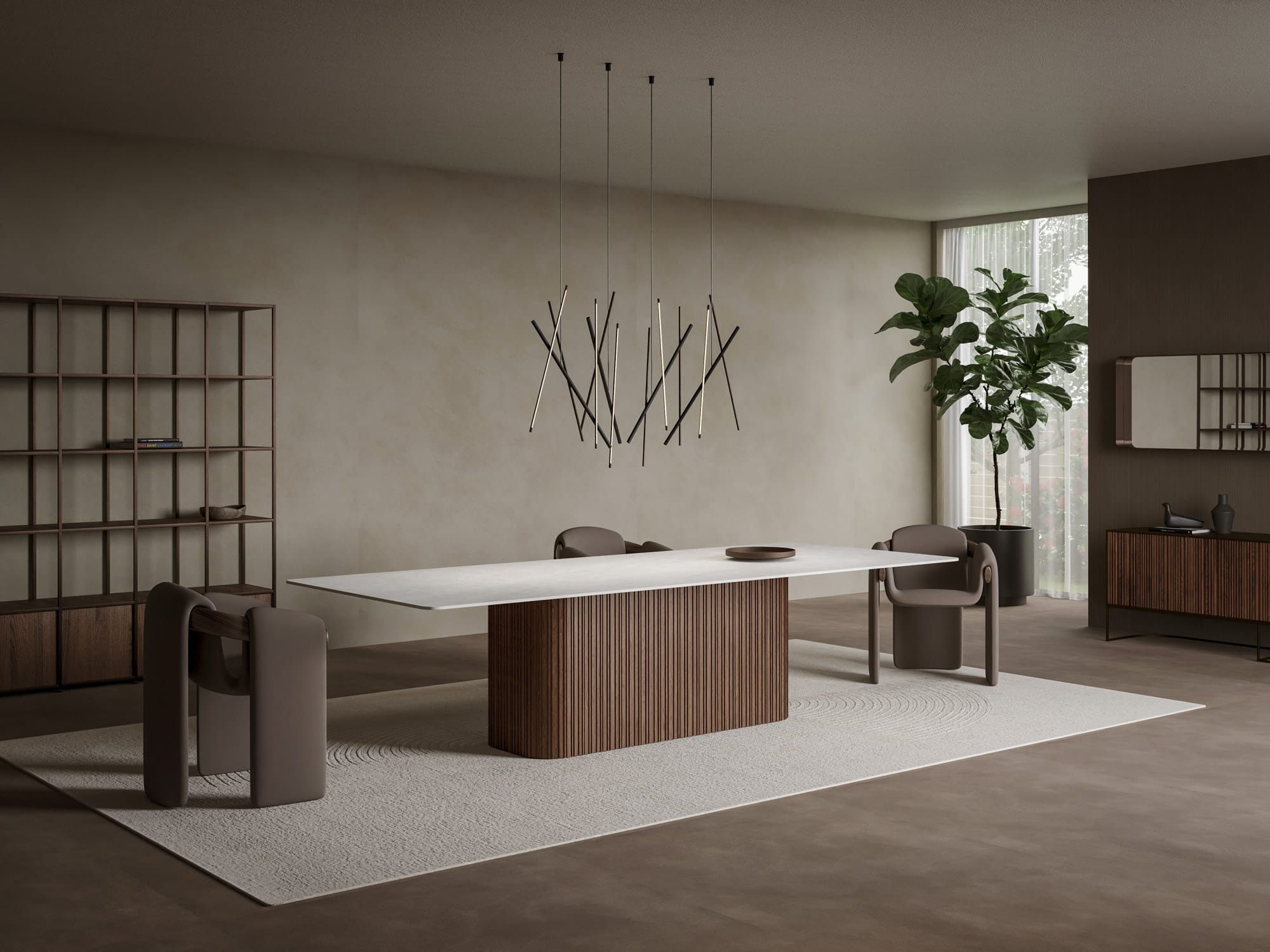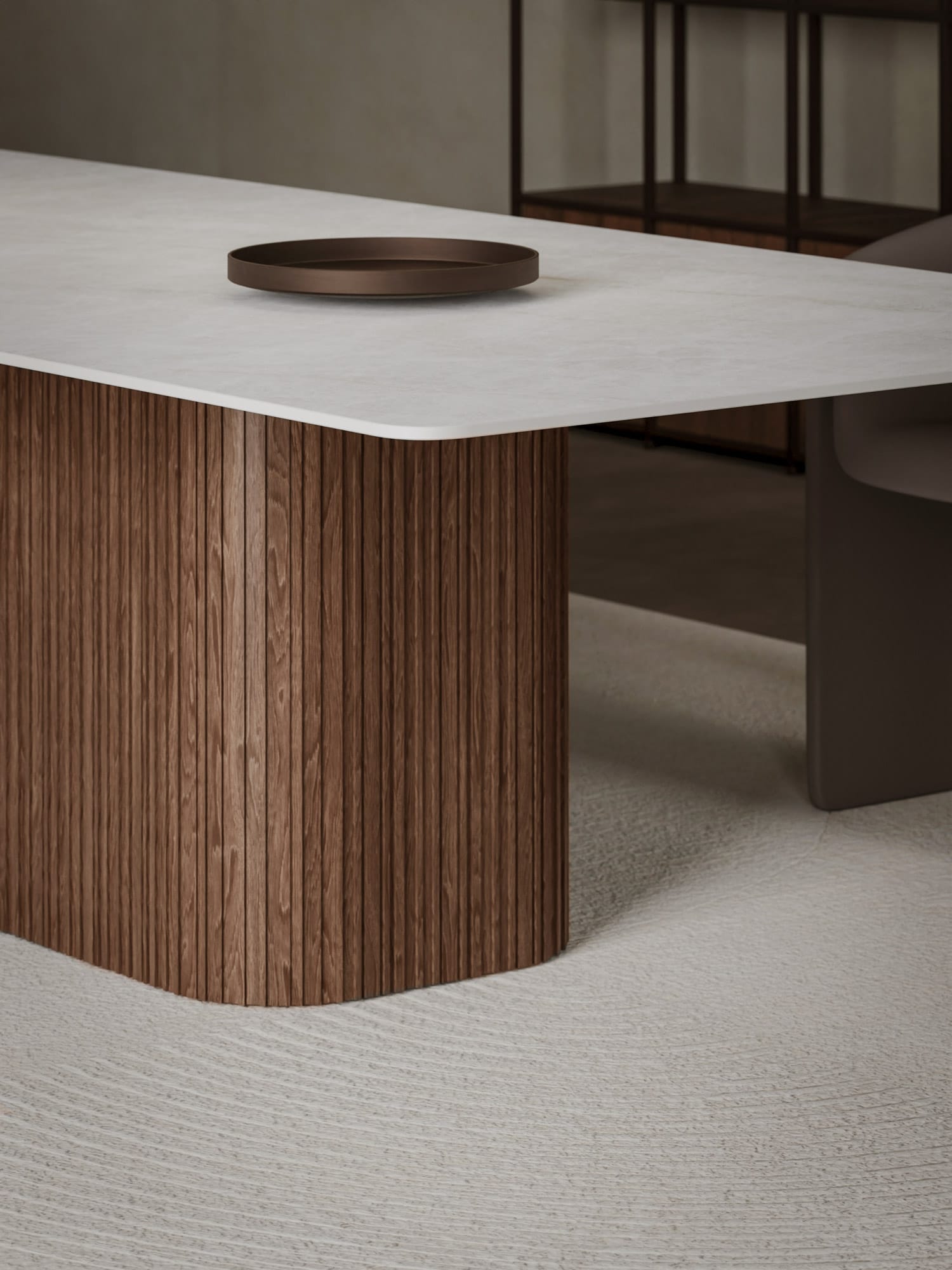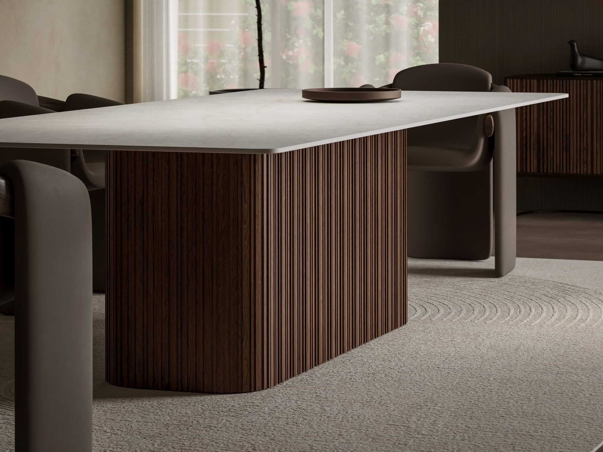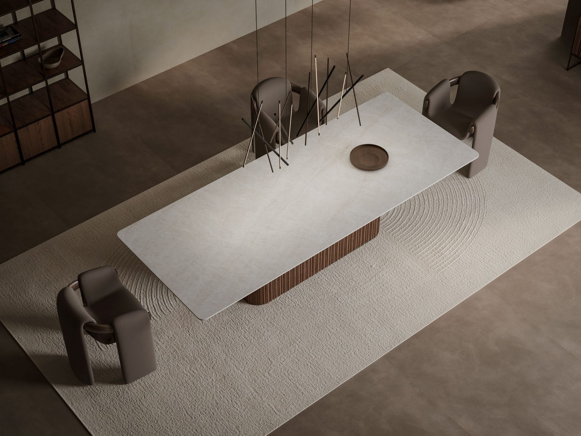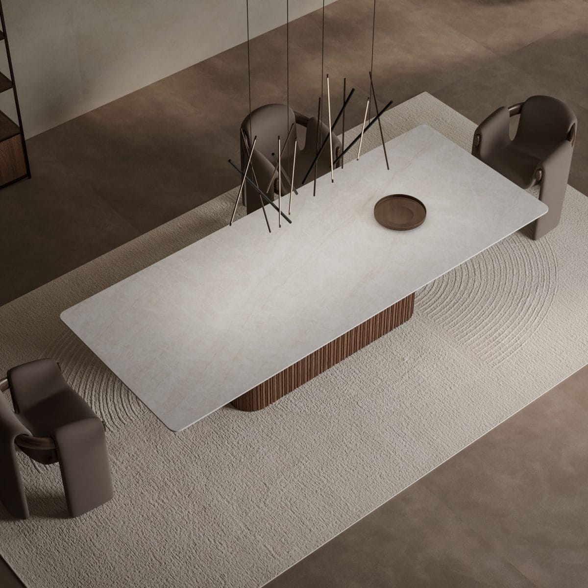 Every table we create is uniquely yours. Choose from our extensive range of porcelain surfaces, from dramatic marble effects to subtle concrete textures, then select the perfect base to complement your style. Whether you prefer the clean lines of our geometric Alveo base, the classical elegance of Colonna columns, or the natural warmth of Romano wood, every element can be tailored to your vision.